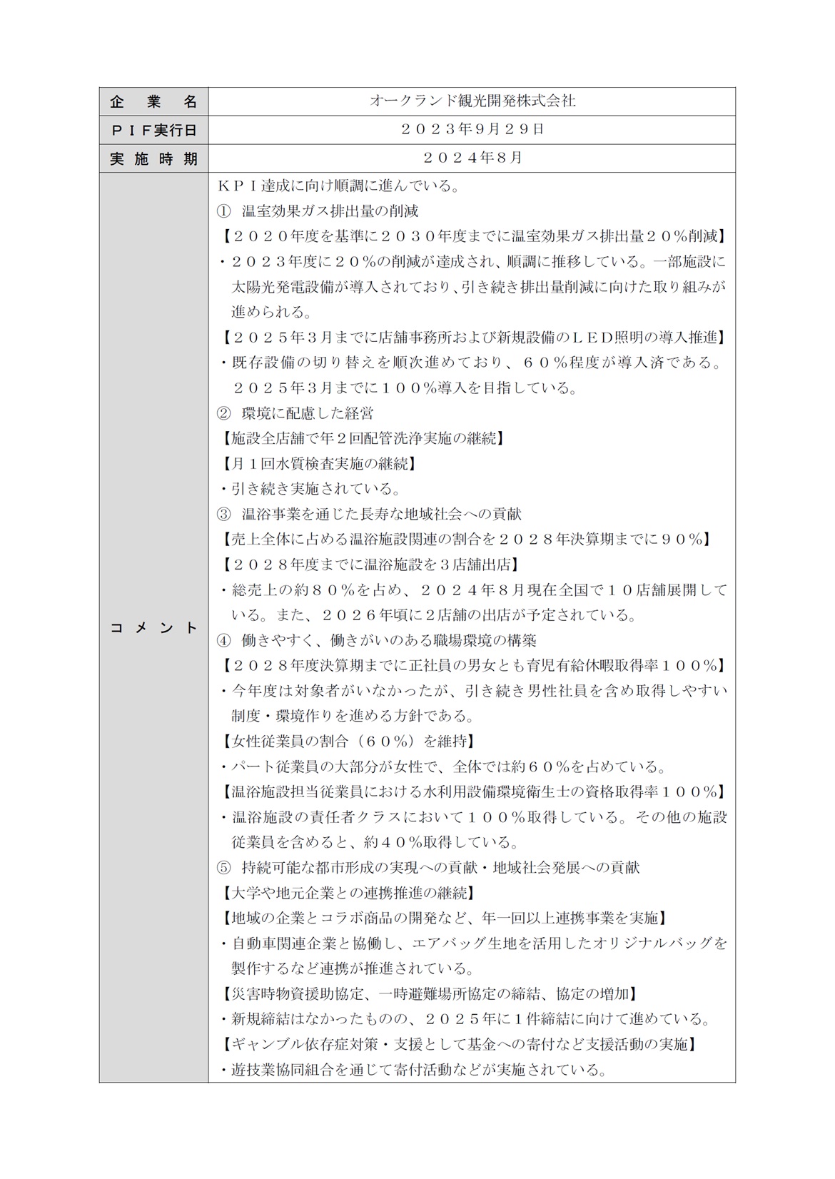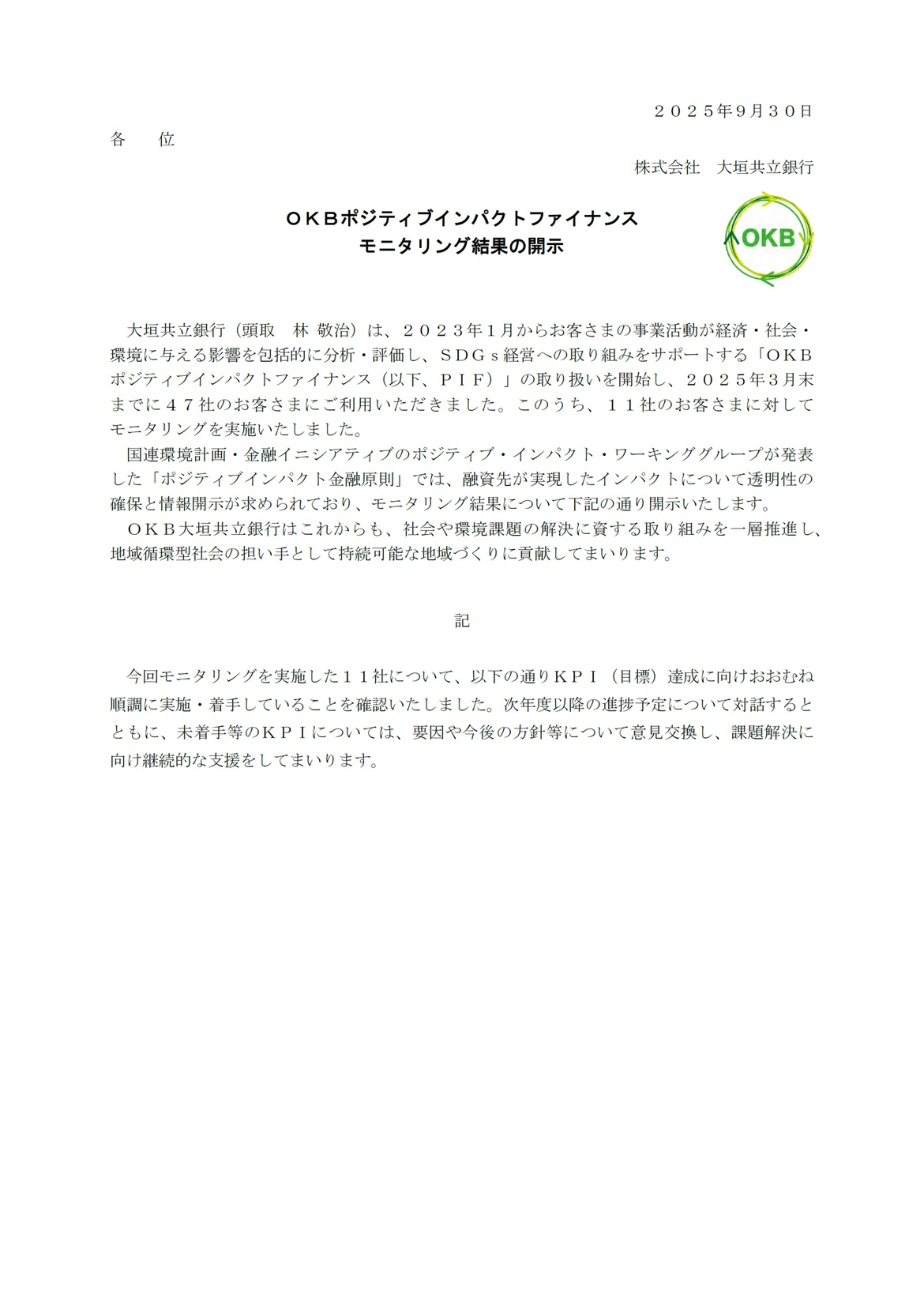 OKBポジティブインパクトファイナンス モニタリング結果の開示