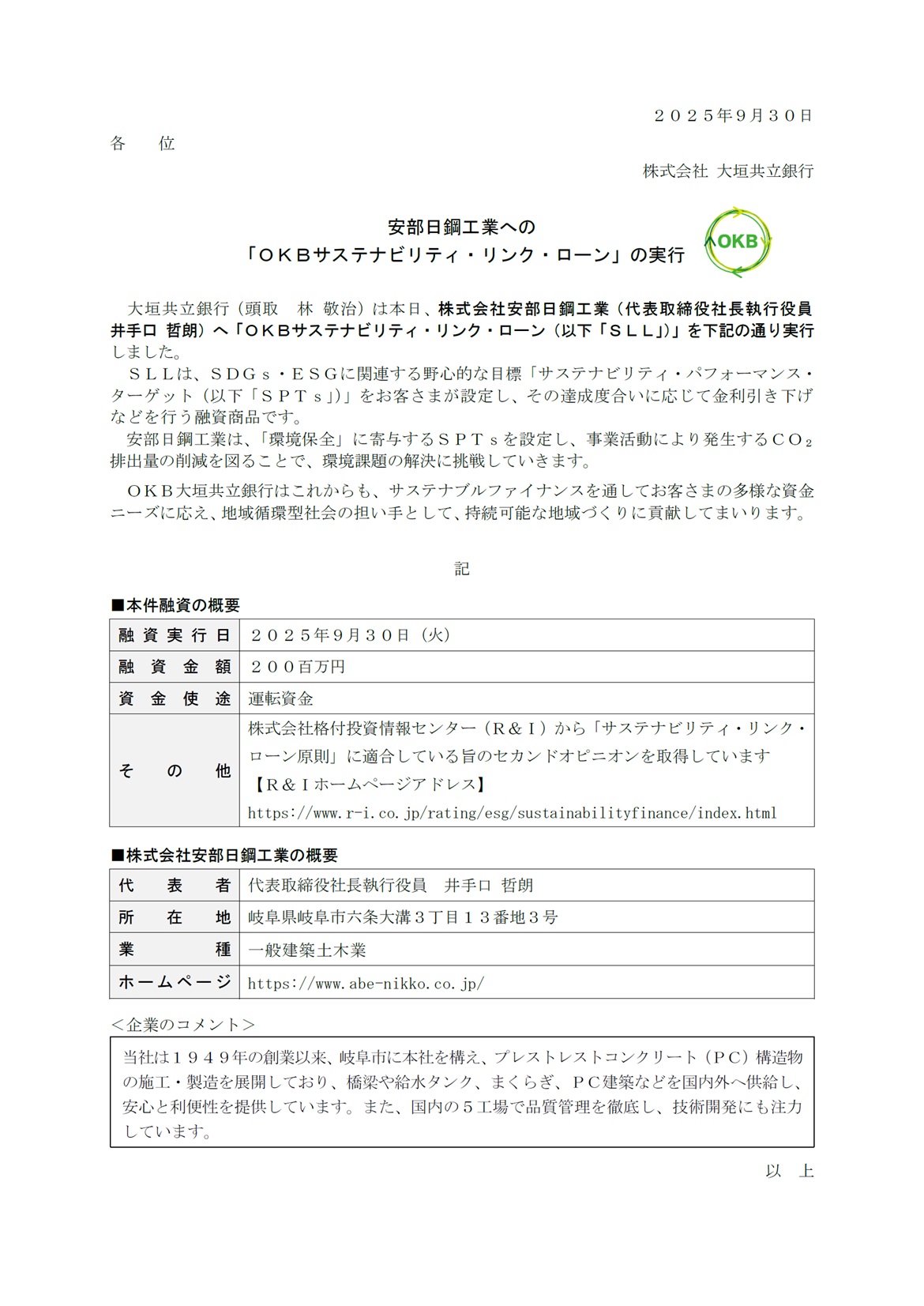 安部日鋼工業への「OKBサステナビリティ・リンク・ローン」の実行