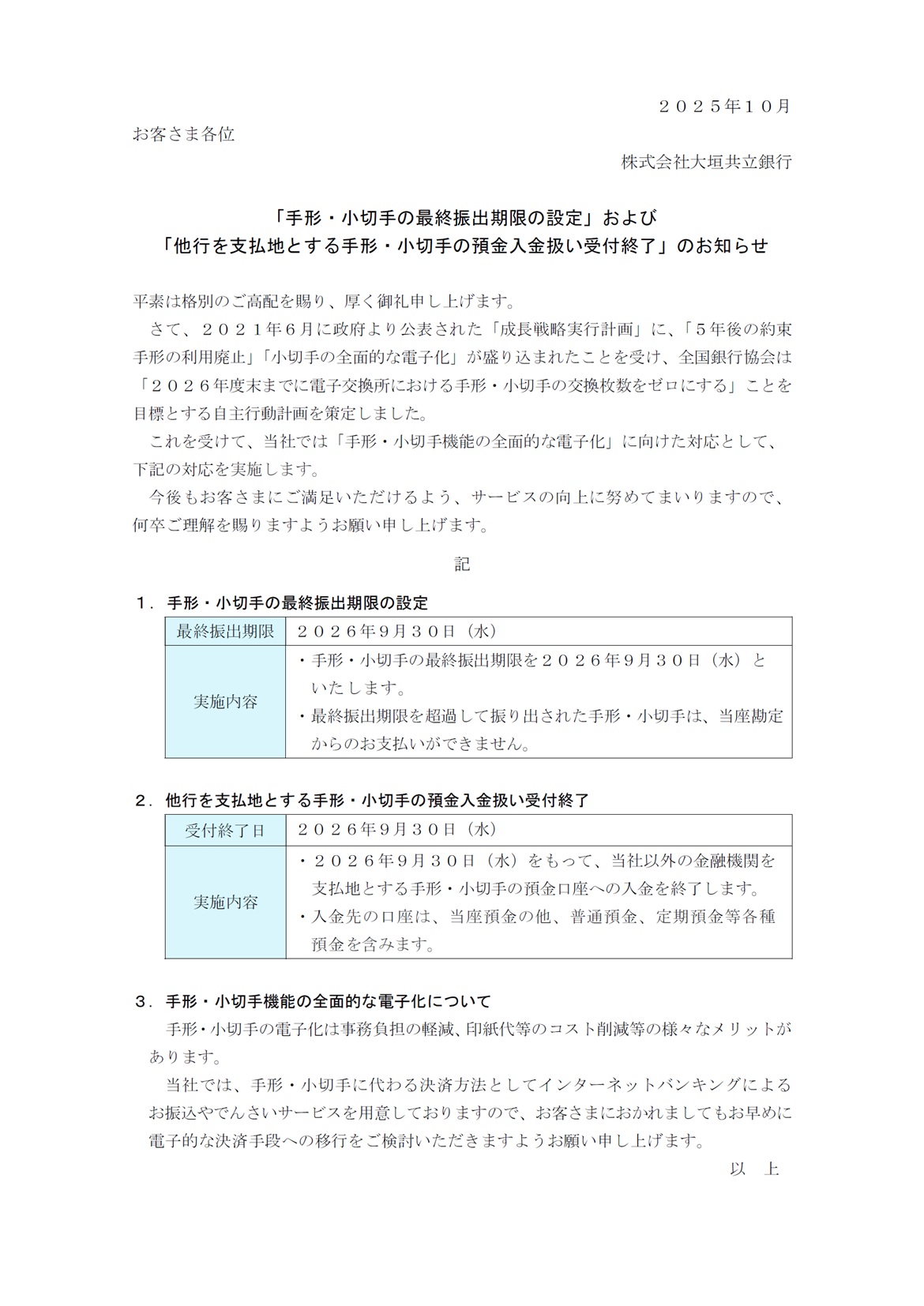 「手形・小切手の最終振出期限の設定」および「他行を支払地とする手形・小切手の預金入金扱い受付終了」のお知らせ