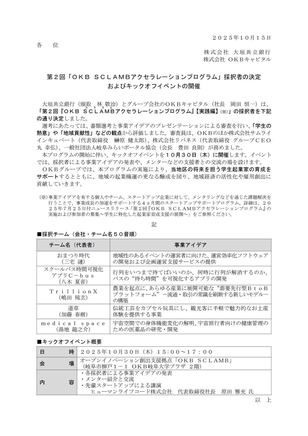 第2回「OKB SCLAMBアクセラレーションプログラム」採択者の決定およびキックオフイベントの開催