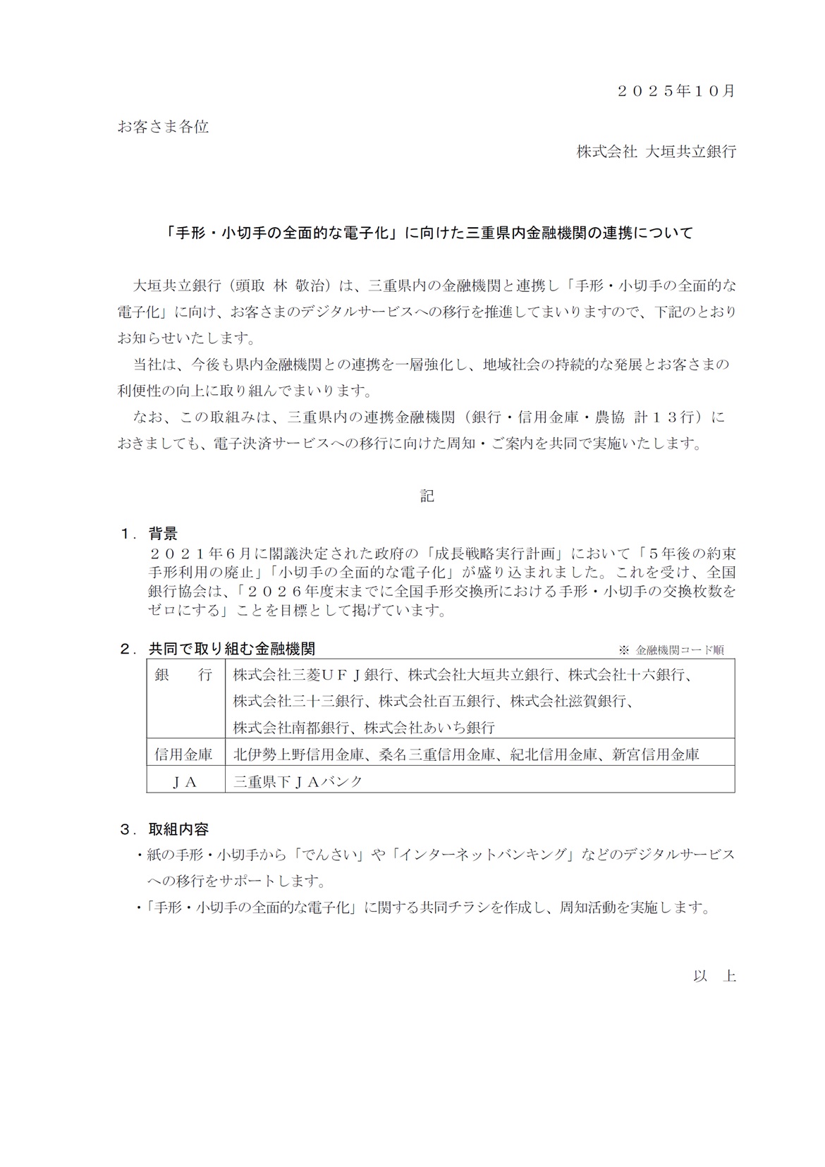 「手形・小切手の全面的な電子化」に向けた三重県内金融機関の連携について