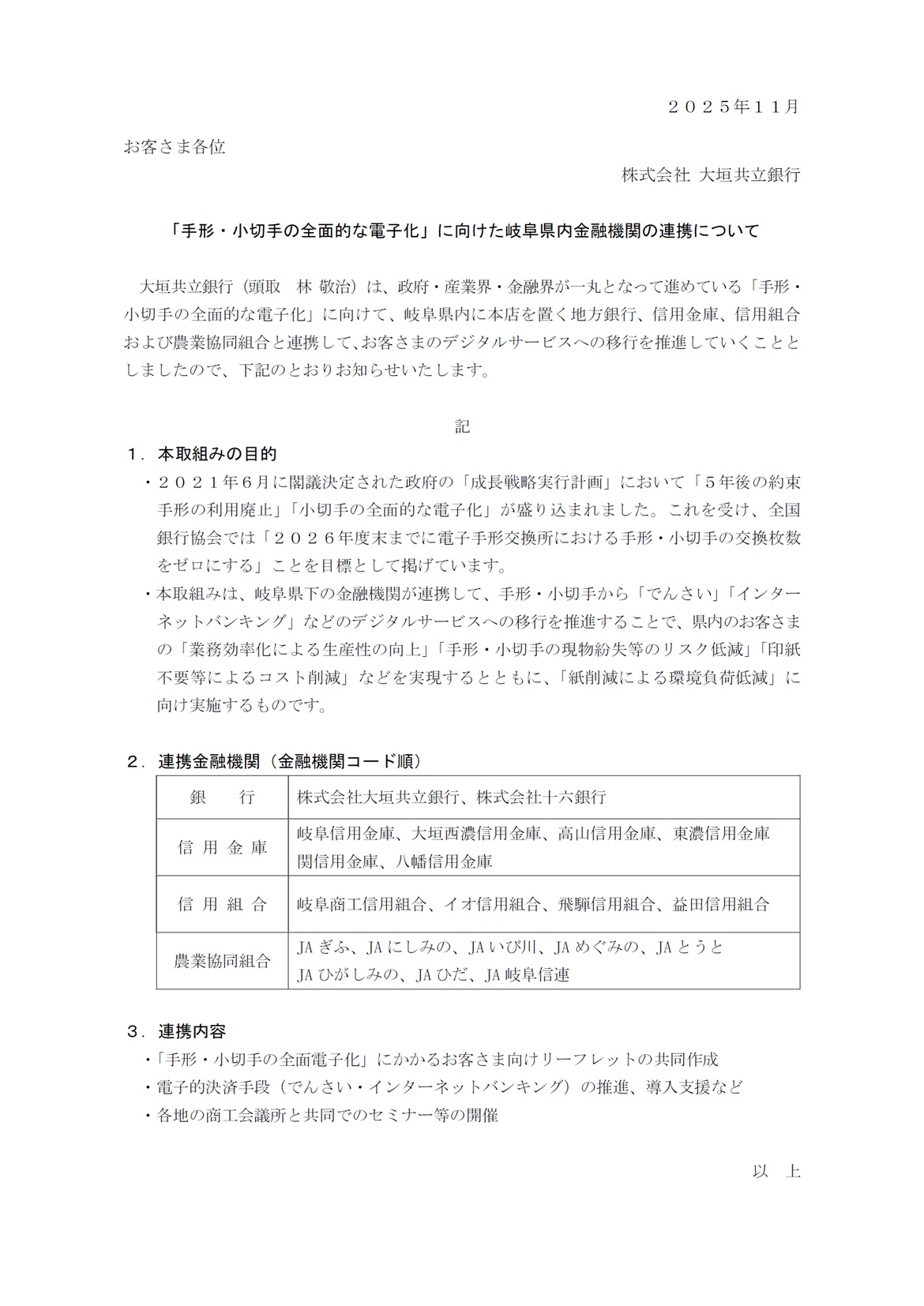 「手形・小切手の全面的な電子化」に向けた岐阜県内金融機関の連携について