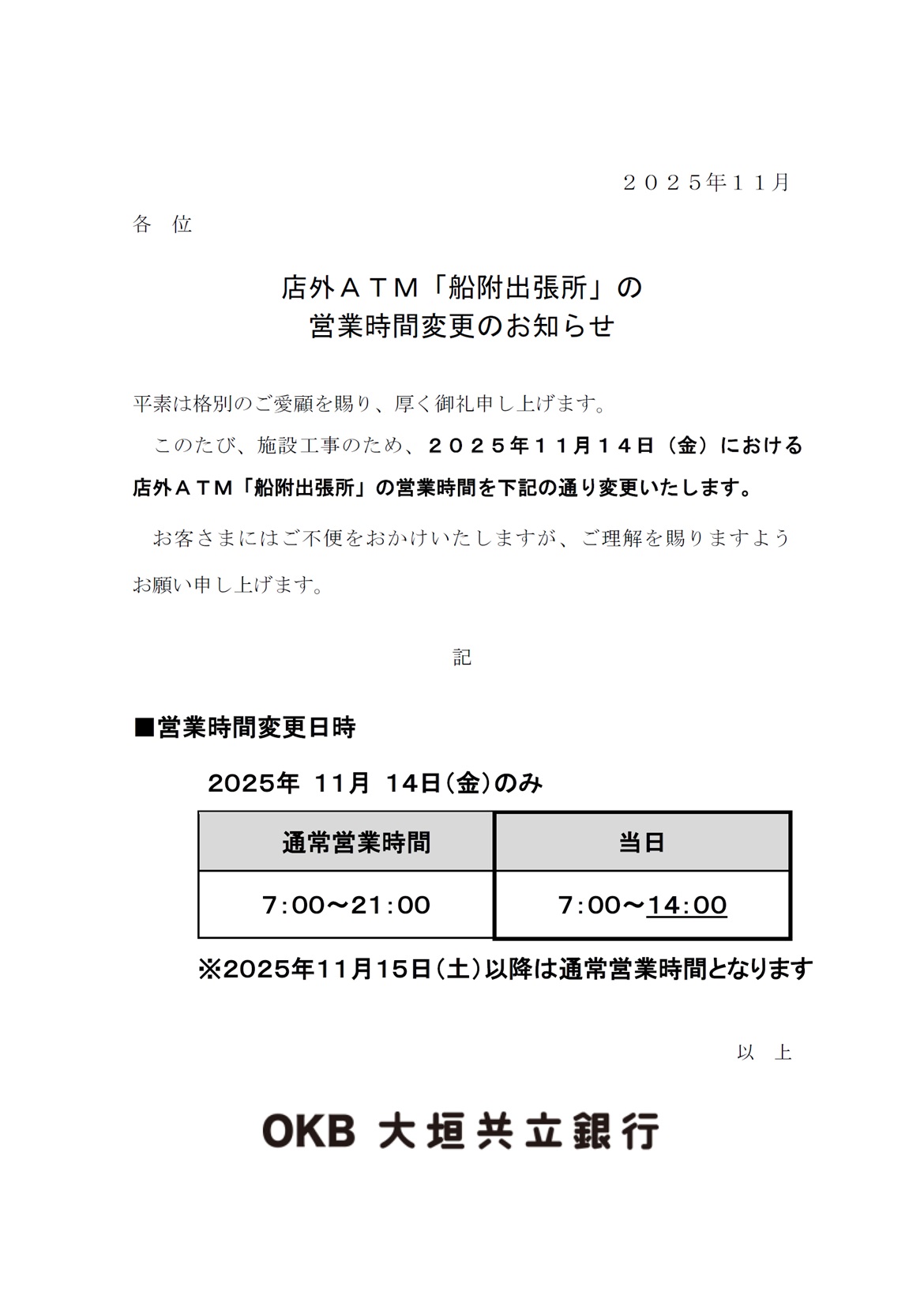 店外ATM「船附出張所」の営業時間変更のお知らせ