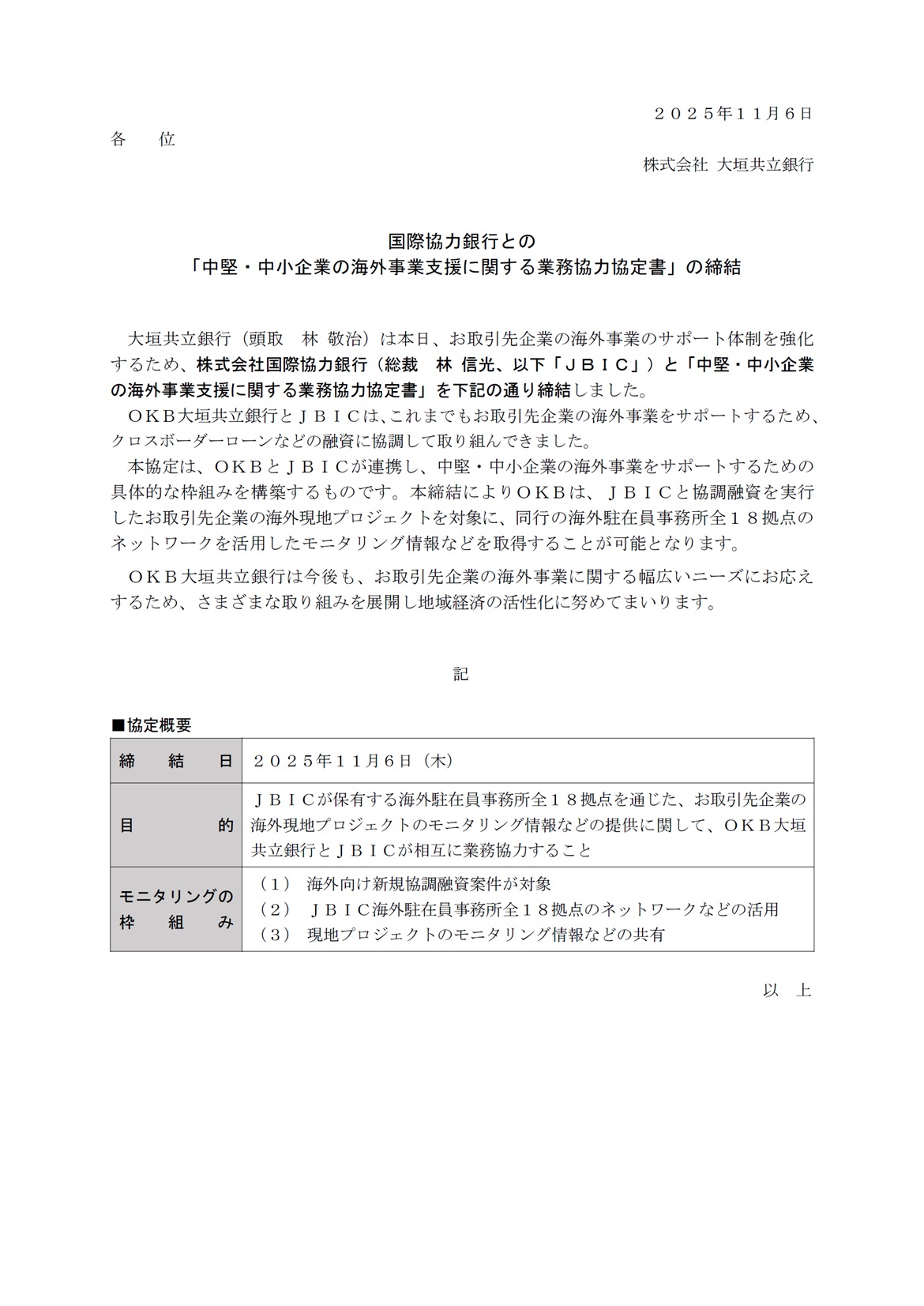 国際協力銀行との「中堅・中小企業の海外事業支援に関する業務協力協定書」の締結