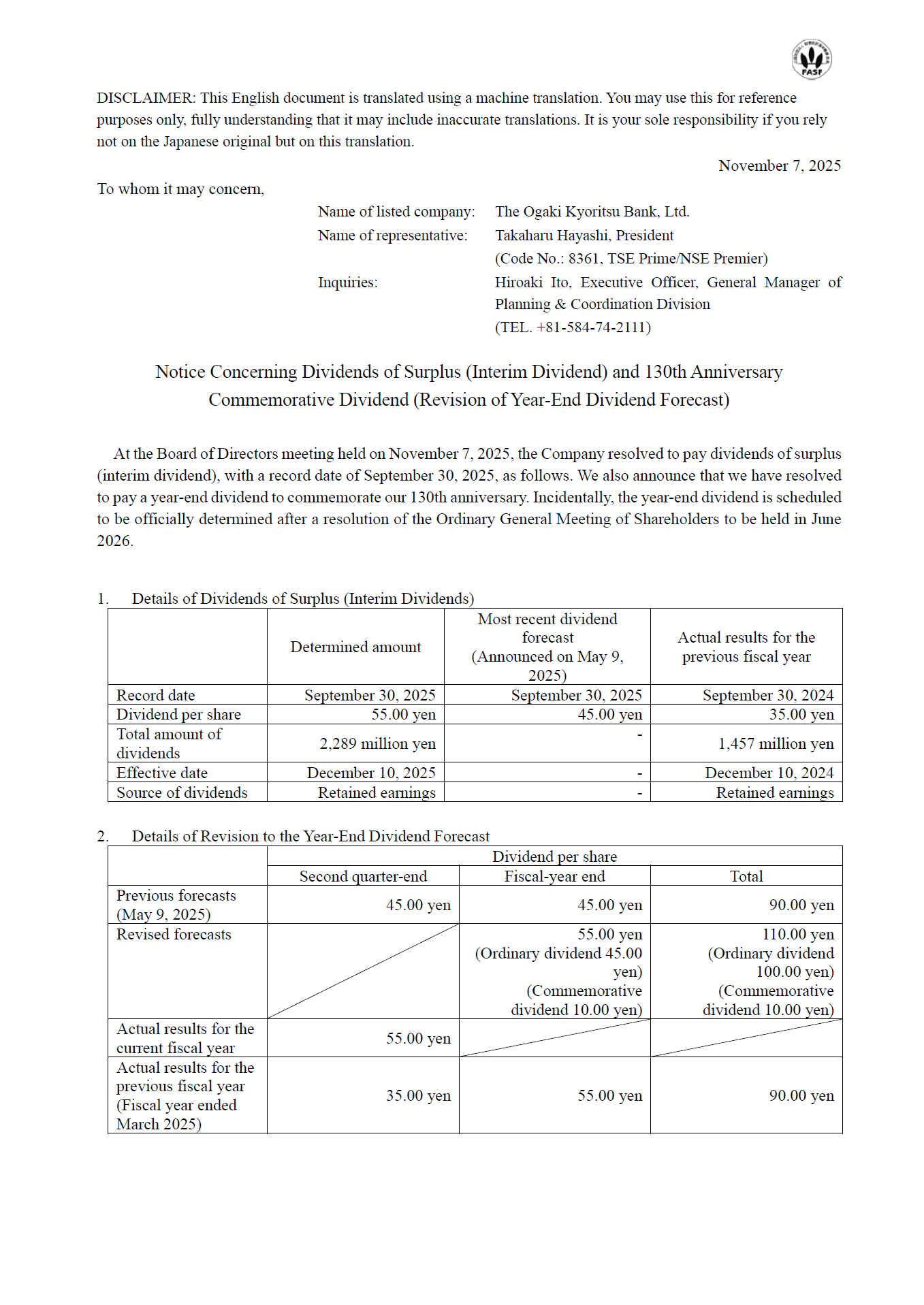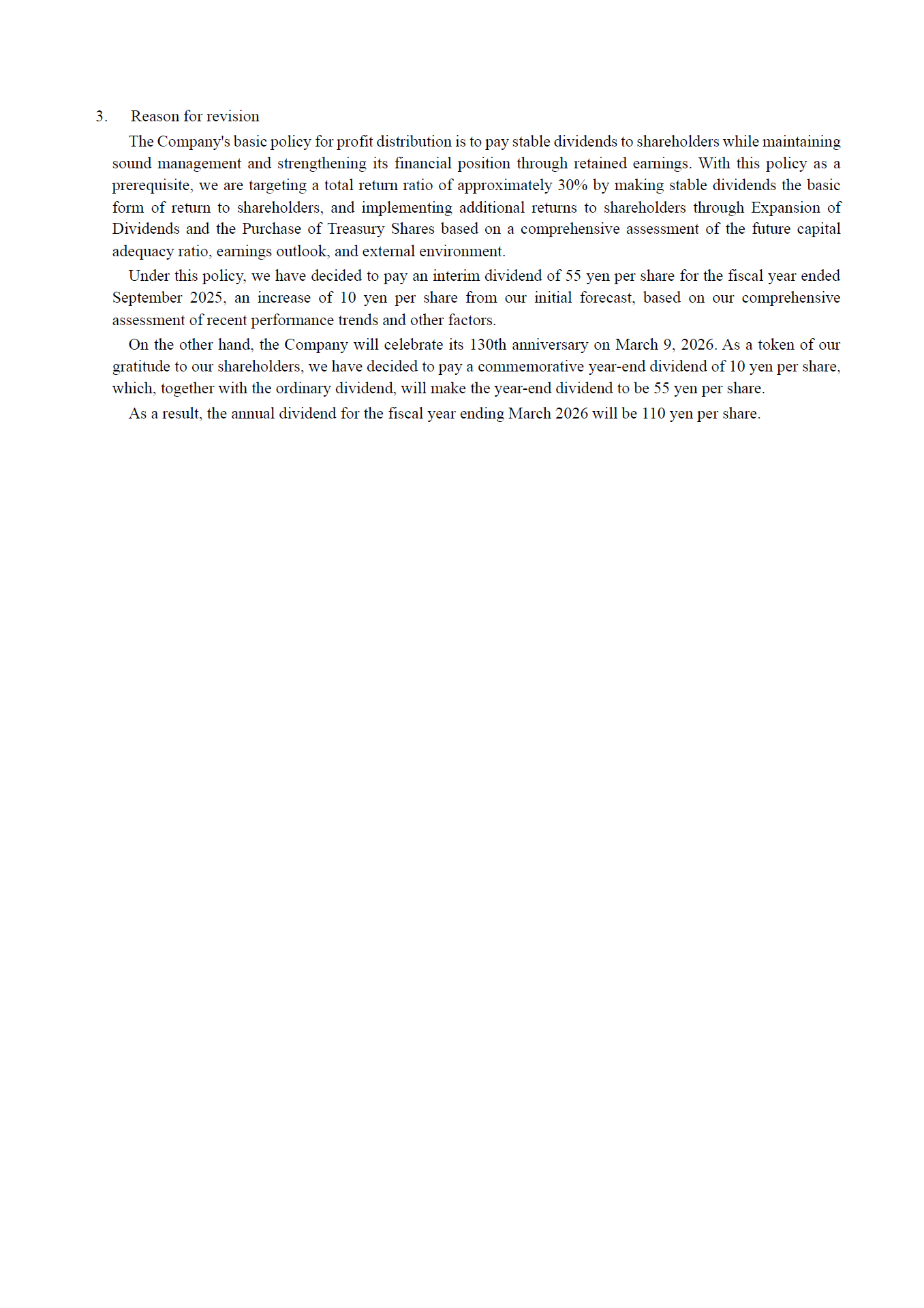 Notice Concerning Dividends of Surplus (Interim Dividend) and 130th Anniversary Commemorative Dividend (Revision of Year-End Dividend Forecast)
