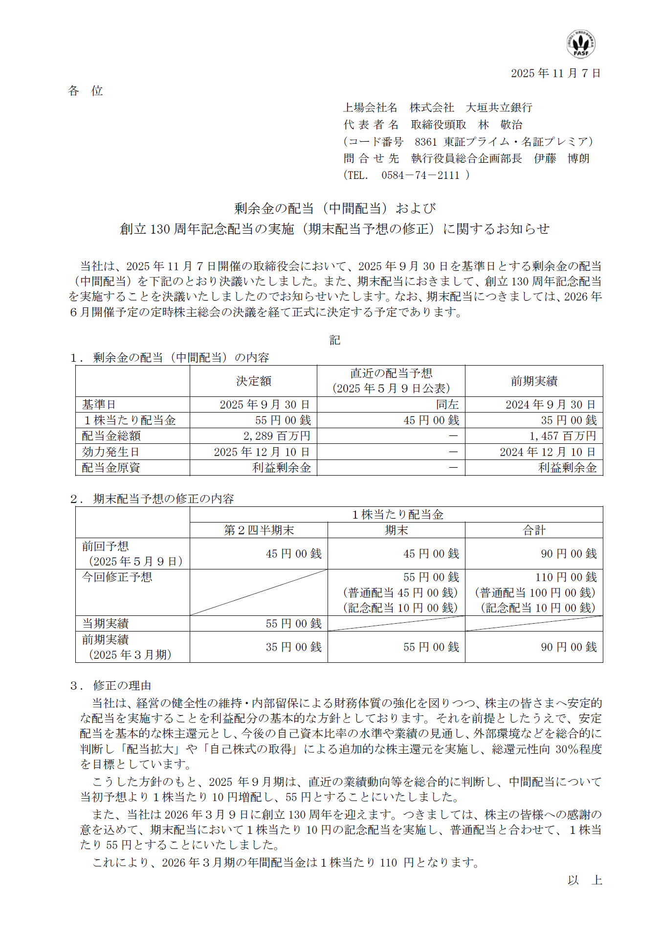 剰余金の配当(中間配当)および 創立130 周年記念配当の実施(期末配当予想の修正)に関するお知らせ