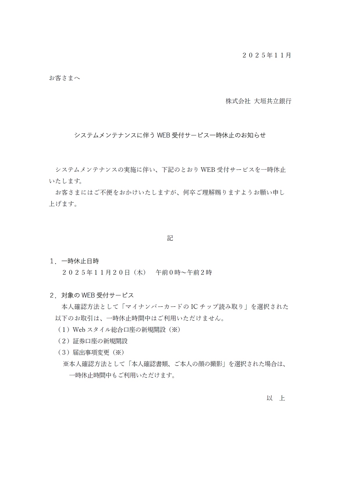 システムメンテナンスに伴うWEB受付サービス一時休止のお知らせ