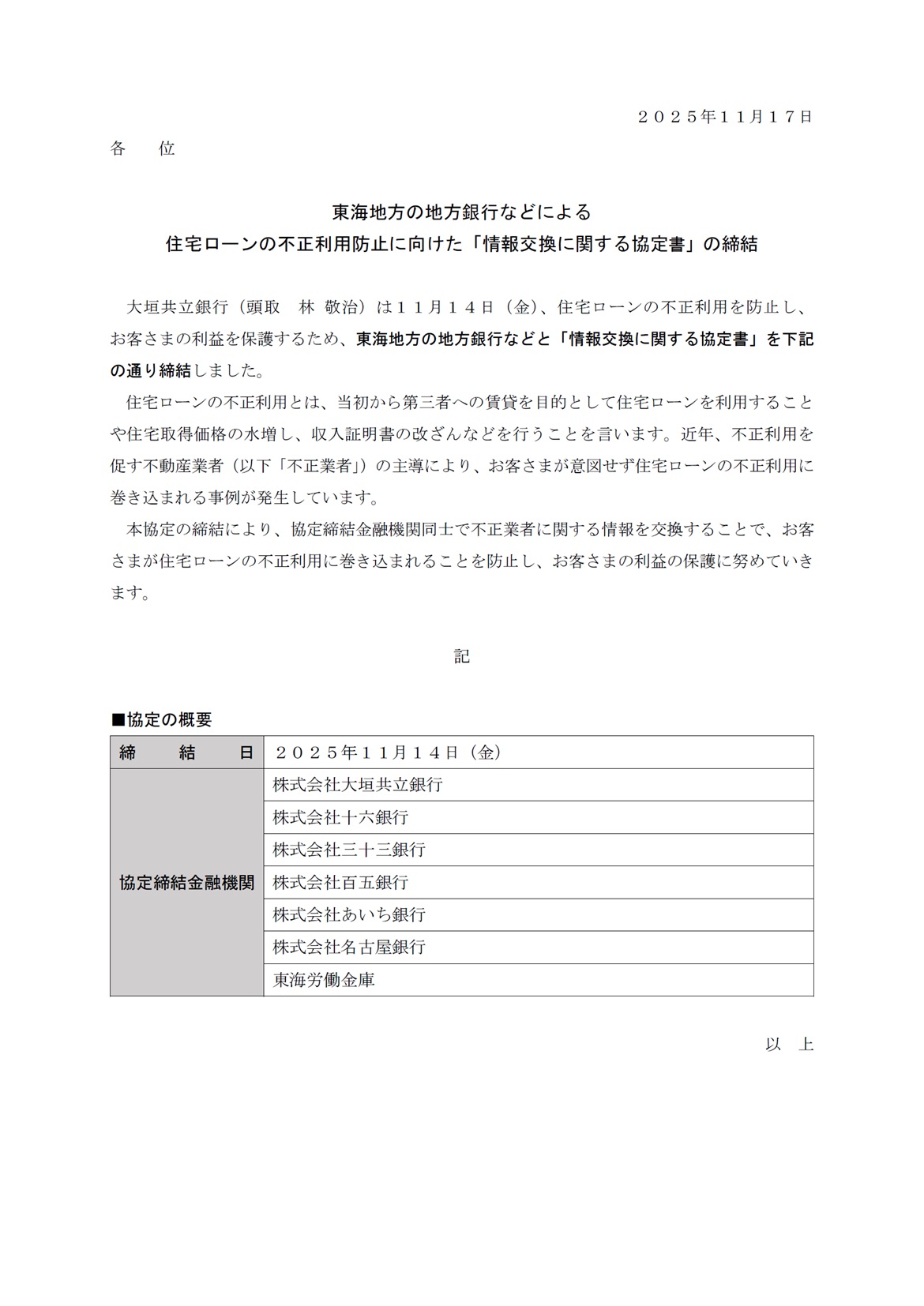 東海地方の地方銀行などによる住宅ローンの不正利用防止に向けた「情報交換に関する協定書」の締結