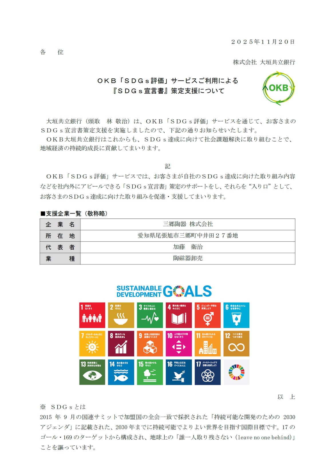OKB「SDGs評価」サービスご利用による『SDGs宣言書』策定支援について