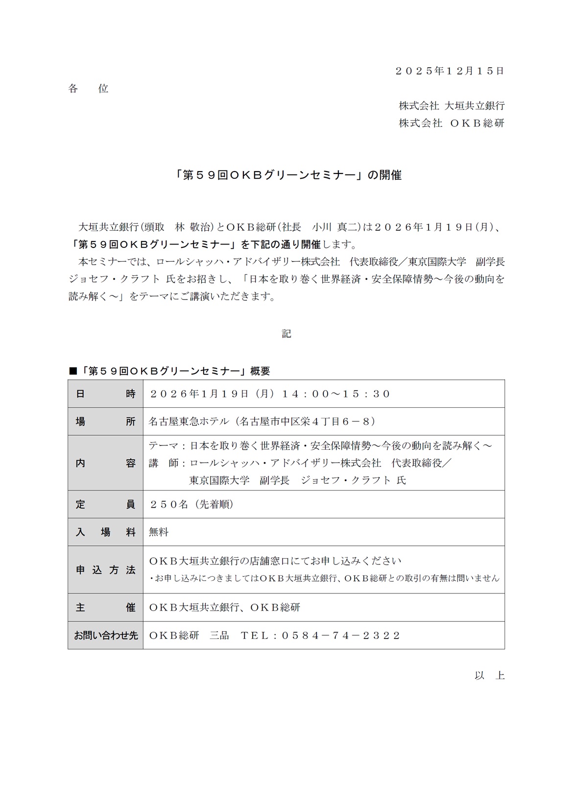 「第59回OKBグリーンセミナー」の開催