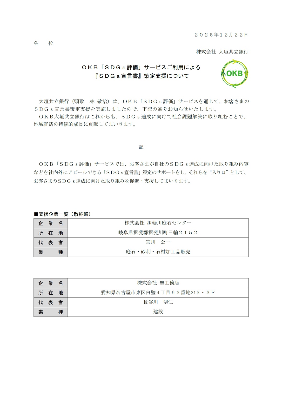 OKB「SDGs評価」サービスご利用による『SDGs宣言書』策定支援について