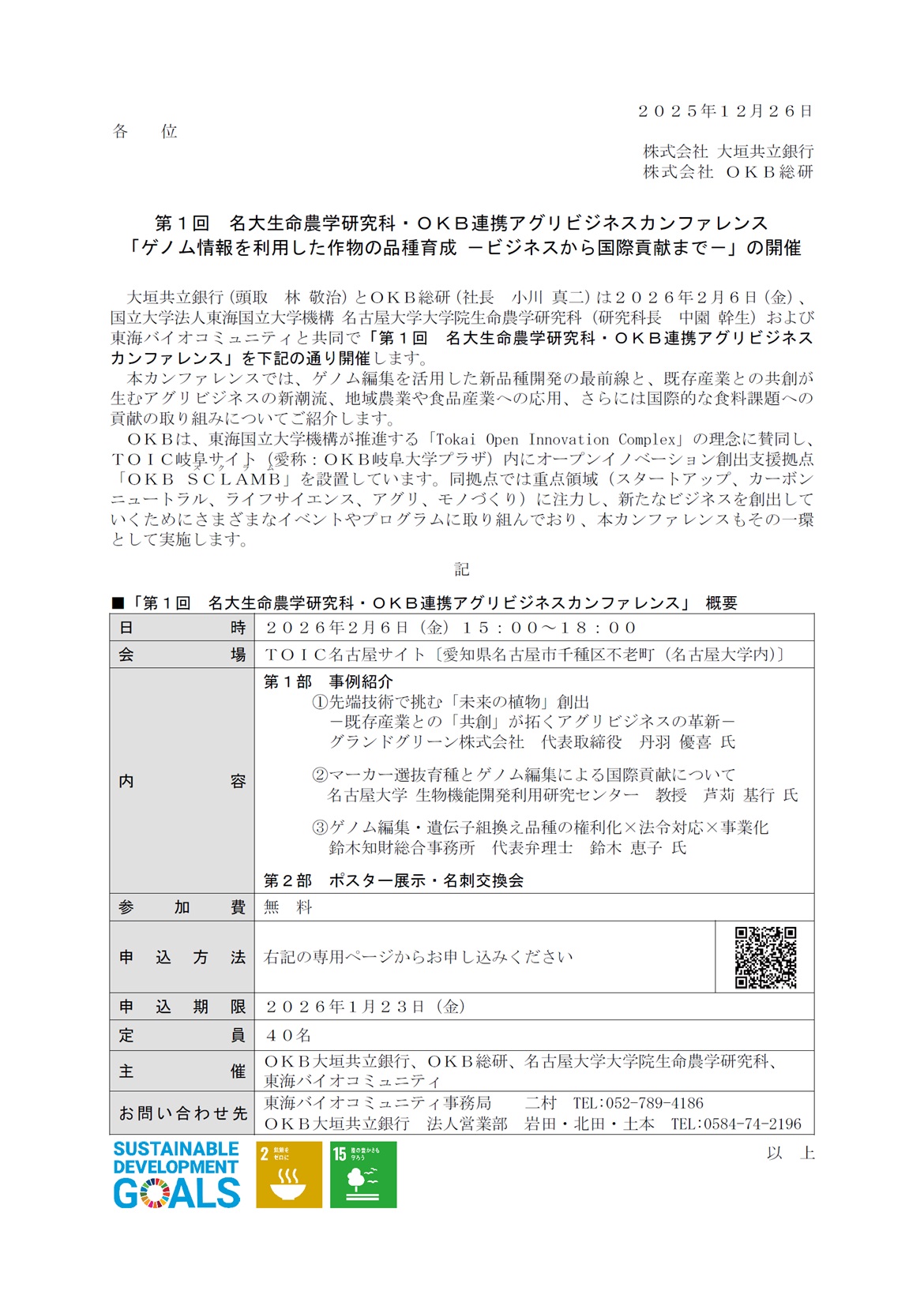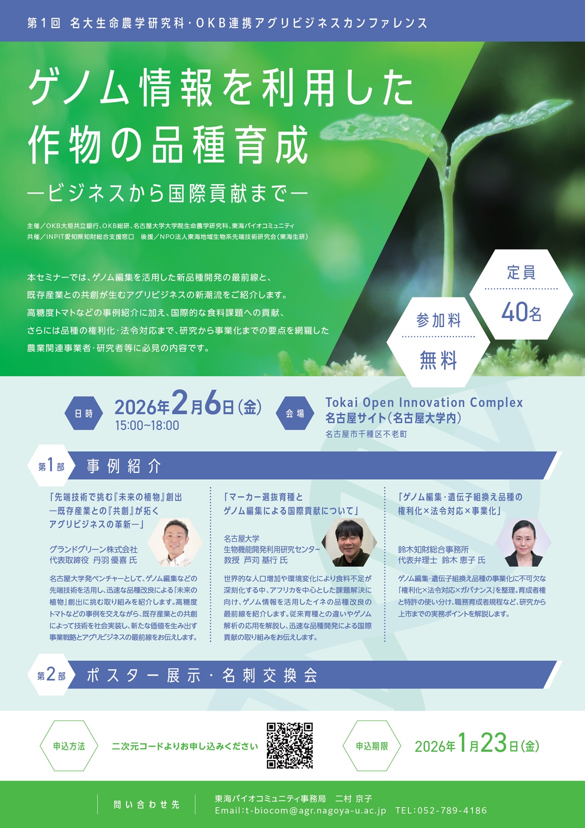 第1回 名大生命農学研究科・OKB連携アグリビジネスカンファレンス「ゲノム情報を利用した作物の品種育成 -ビジネスから国際貢献まで-」の開催