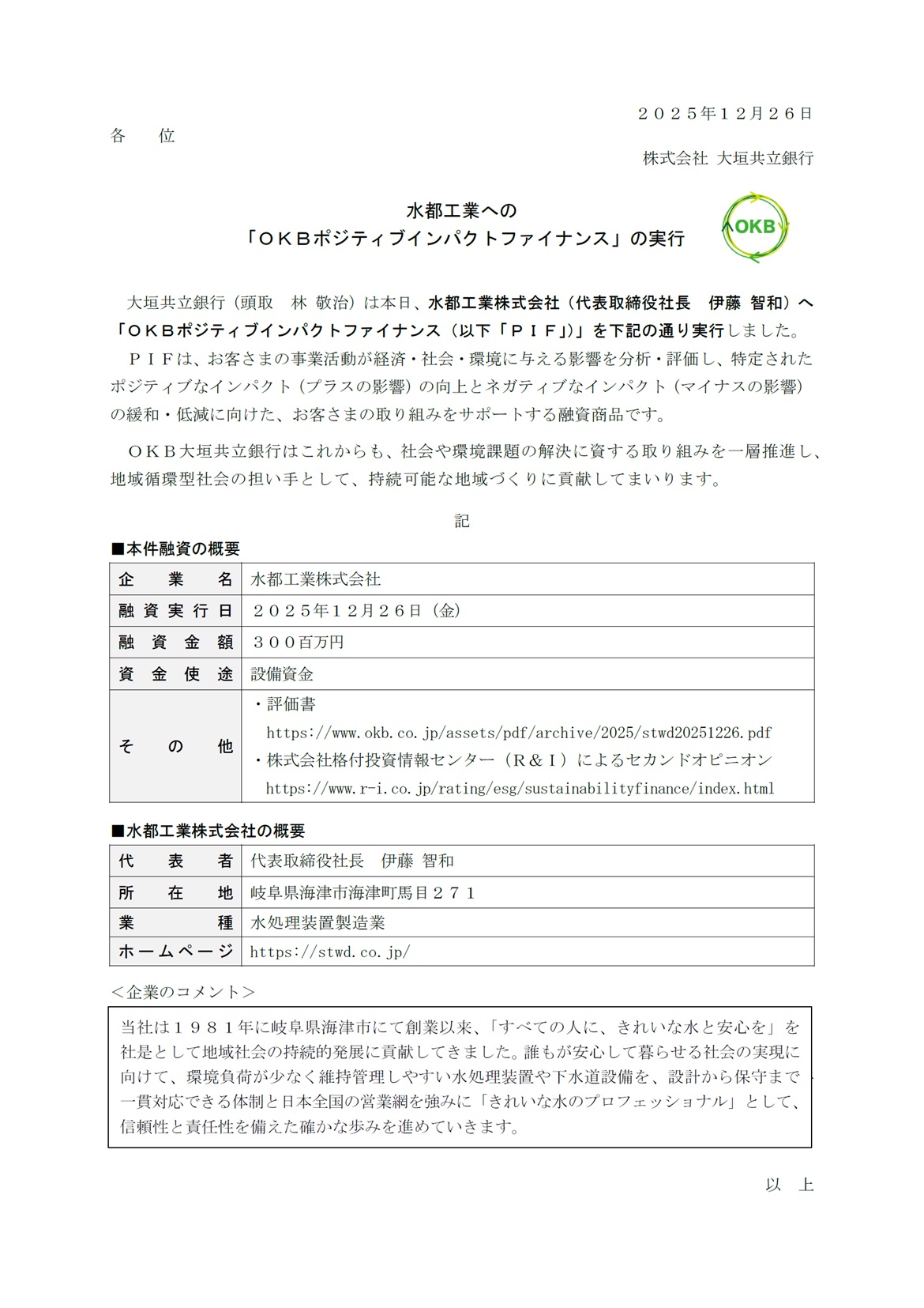 水都工業への「OKBポジティブインパクトファイナンス」の実行