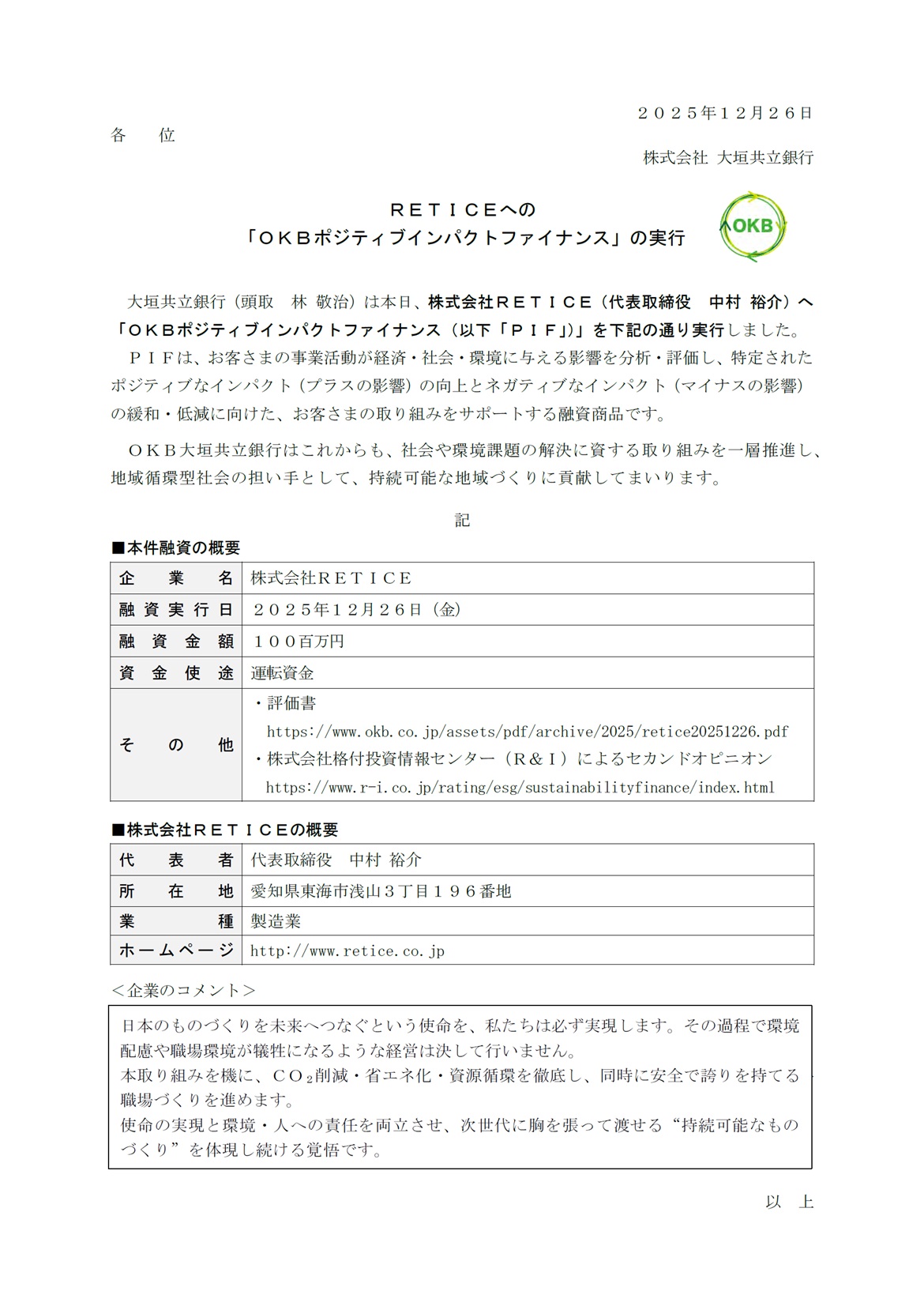RETICEへの「OKBポジティブインパクトファイナンス」の実行