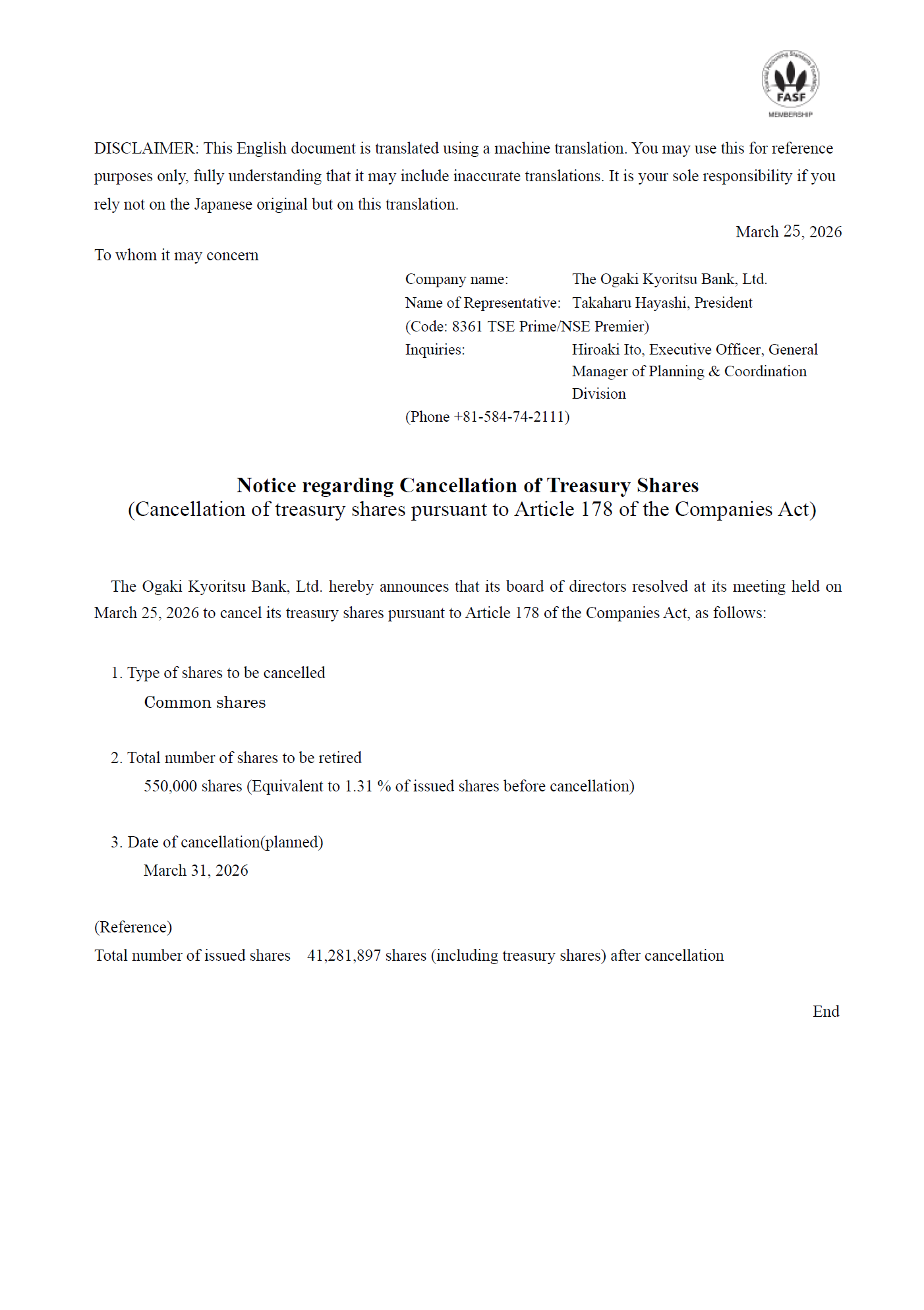 Notice regarding Cancellation of Treasury Shares
