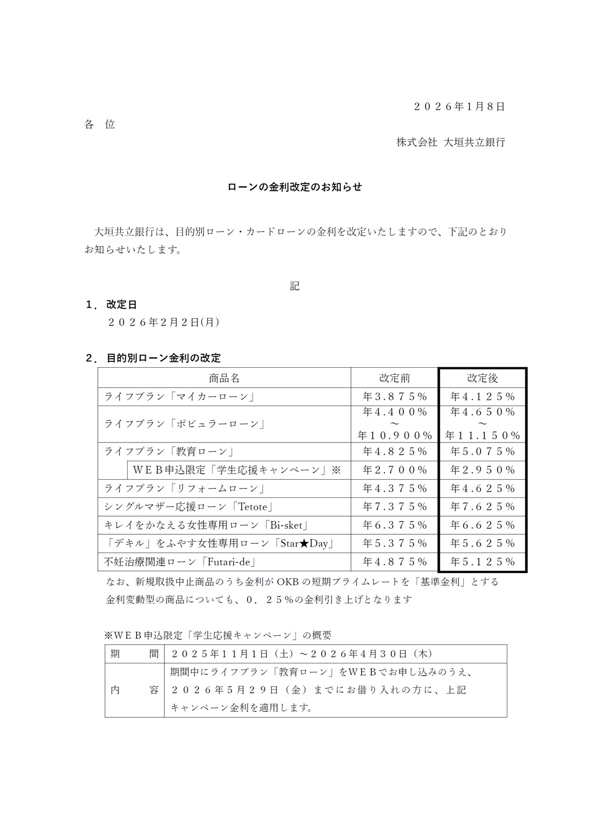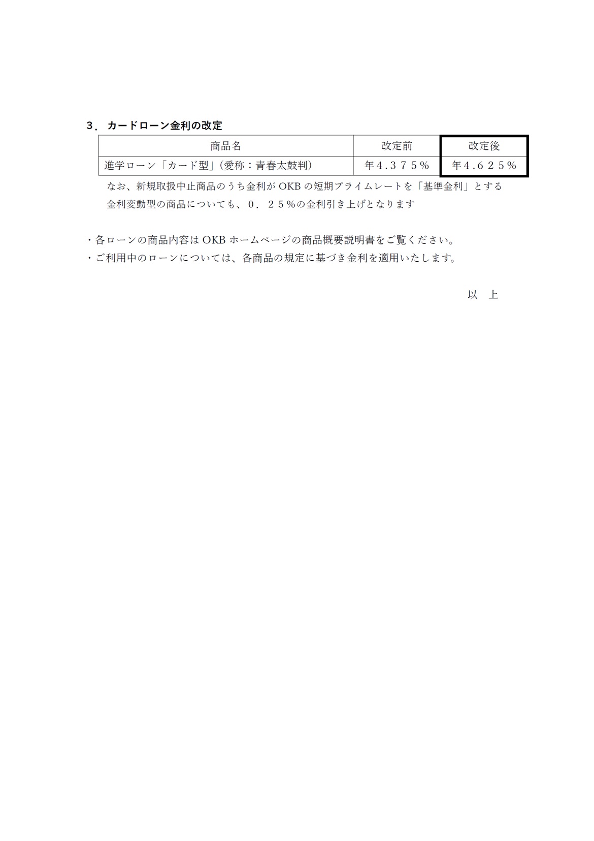 ローンの金利改定のお知らせ