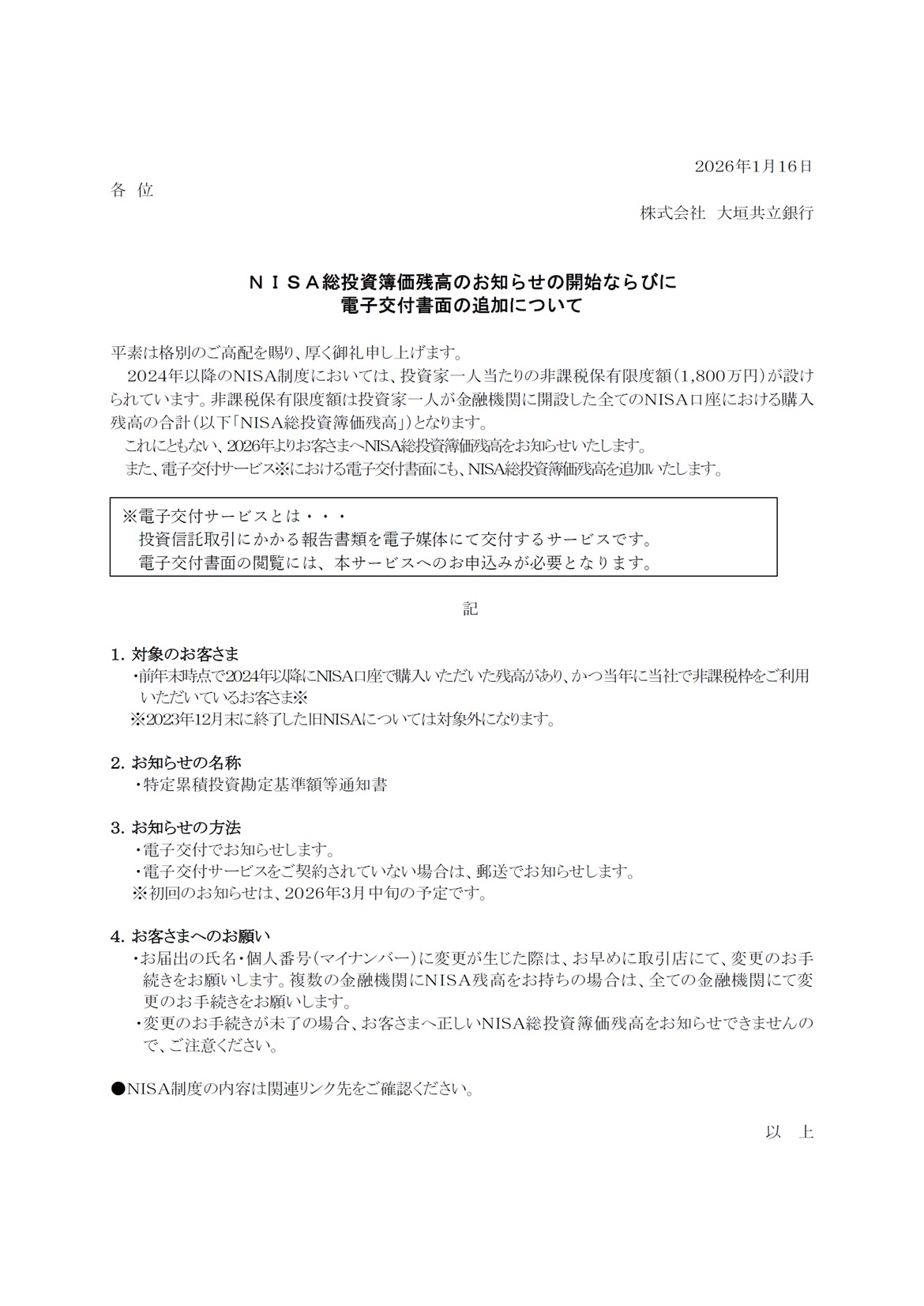 NISA総投資簿価残高のお知らせの開始ならびに電子交付書面の追加について