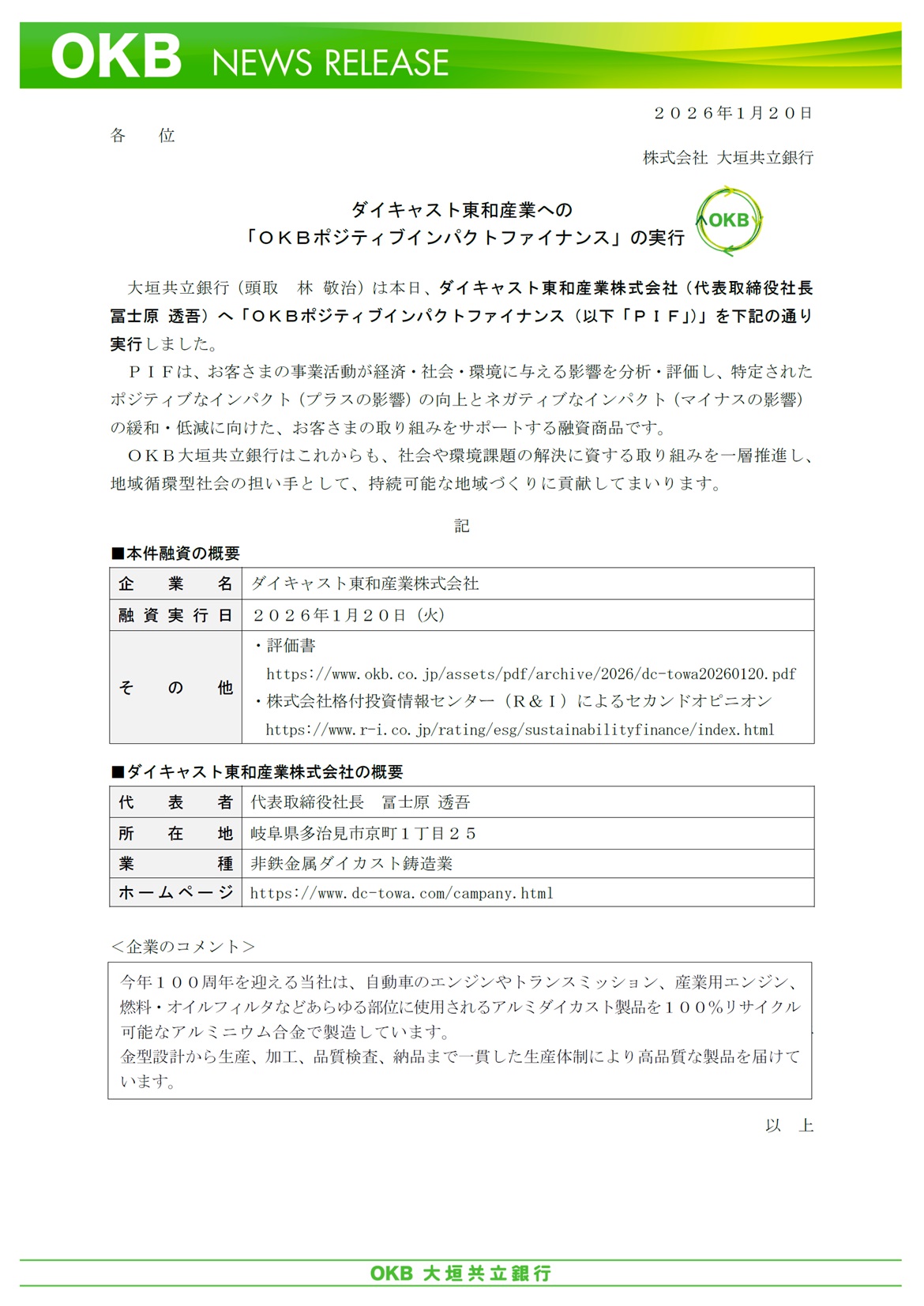 ダイキャスト東和産業への「OKBポジティブインパクトファイナンス」の実行