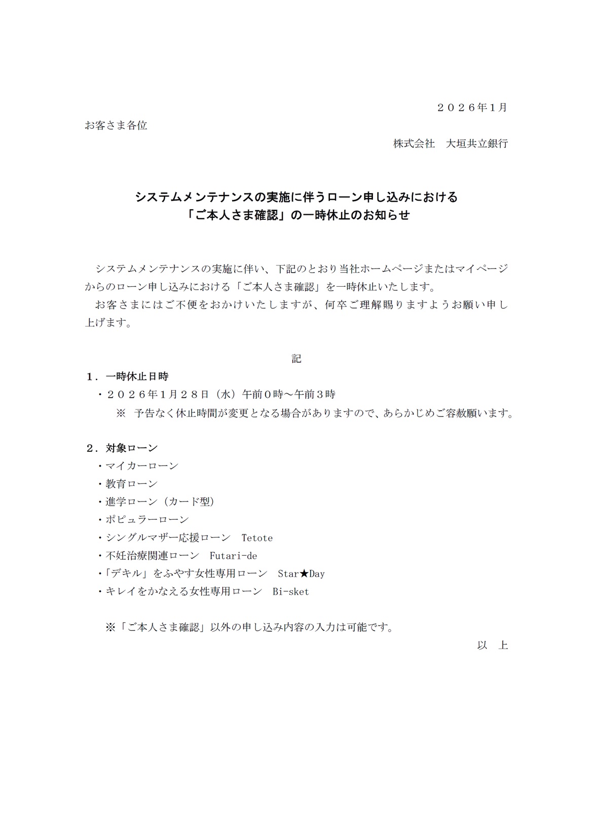 システムメンテナンスの実施に伴うローン申し込みにおける「ご本人さま確認」の一時休止のお知らせ