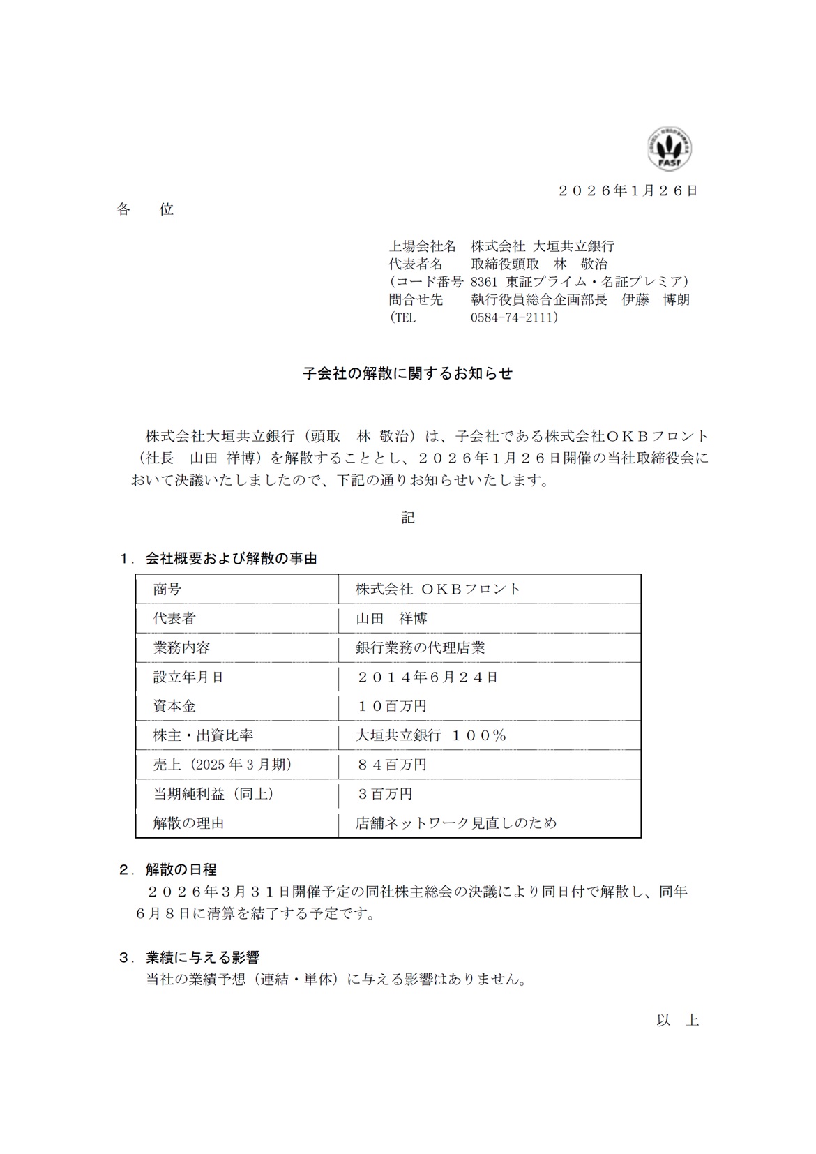 子会社の解散に関するお知らせ