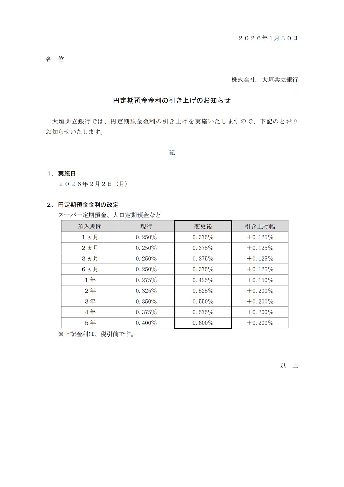円定期預金金利の引き上げのお知らせ