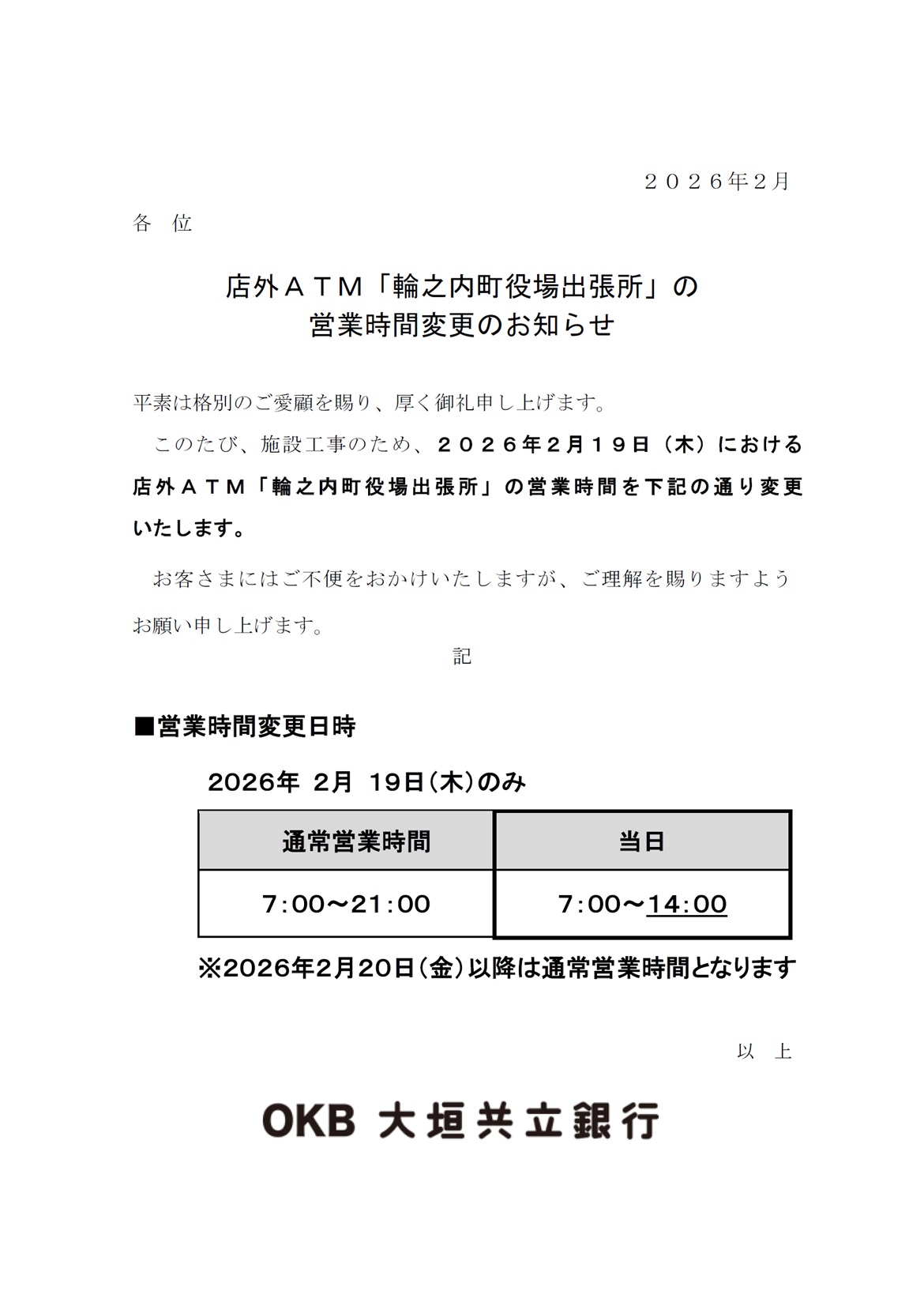 店外ATM「輪之内町役場出張所」の営業時間変更のお知らせ