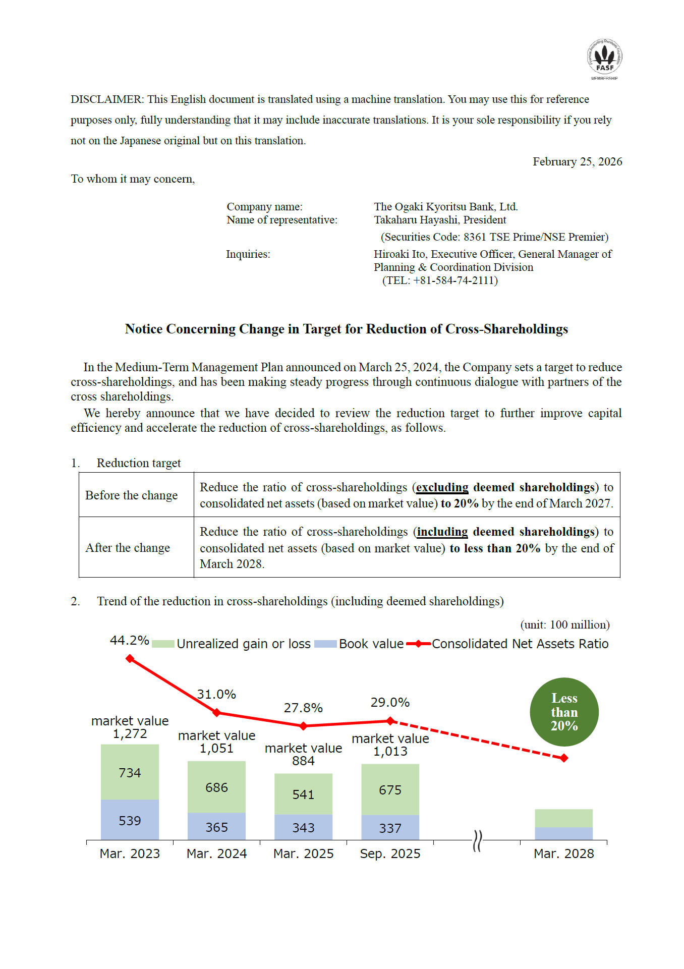 Notice Concerning Change in Target for Reduction of Cross-Shareholdings