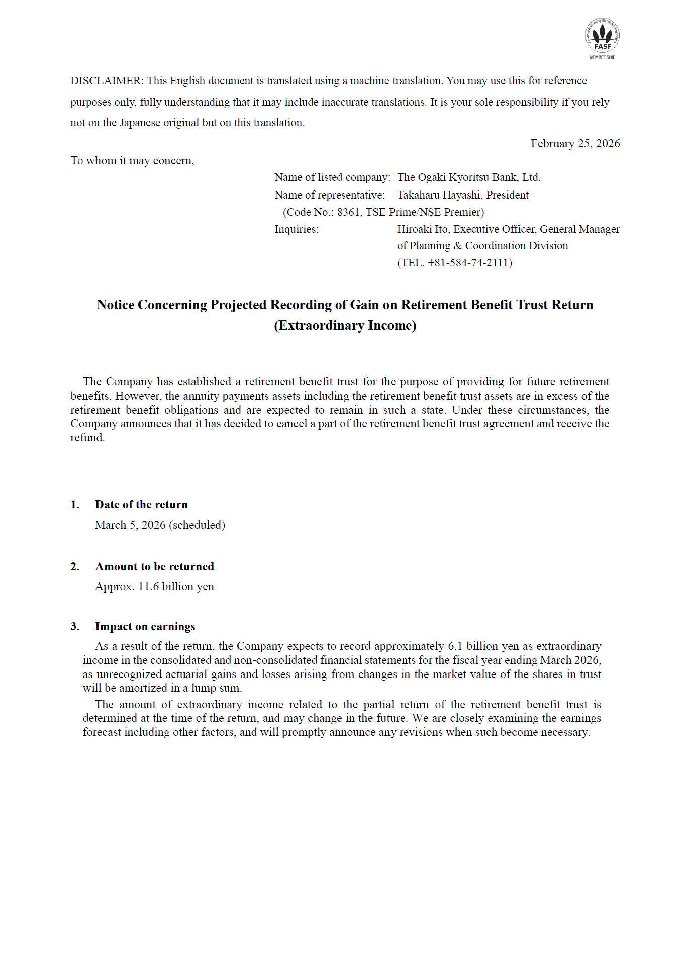 Notice Concerning Projected Recording of Gain on Retirement Benefit Trust Return (Extraordinary Income)