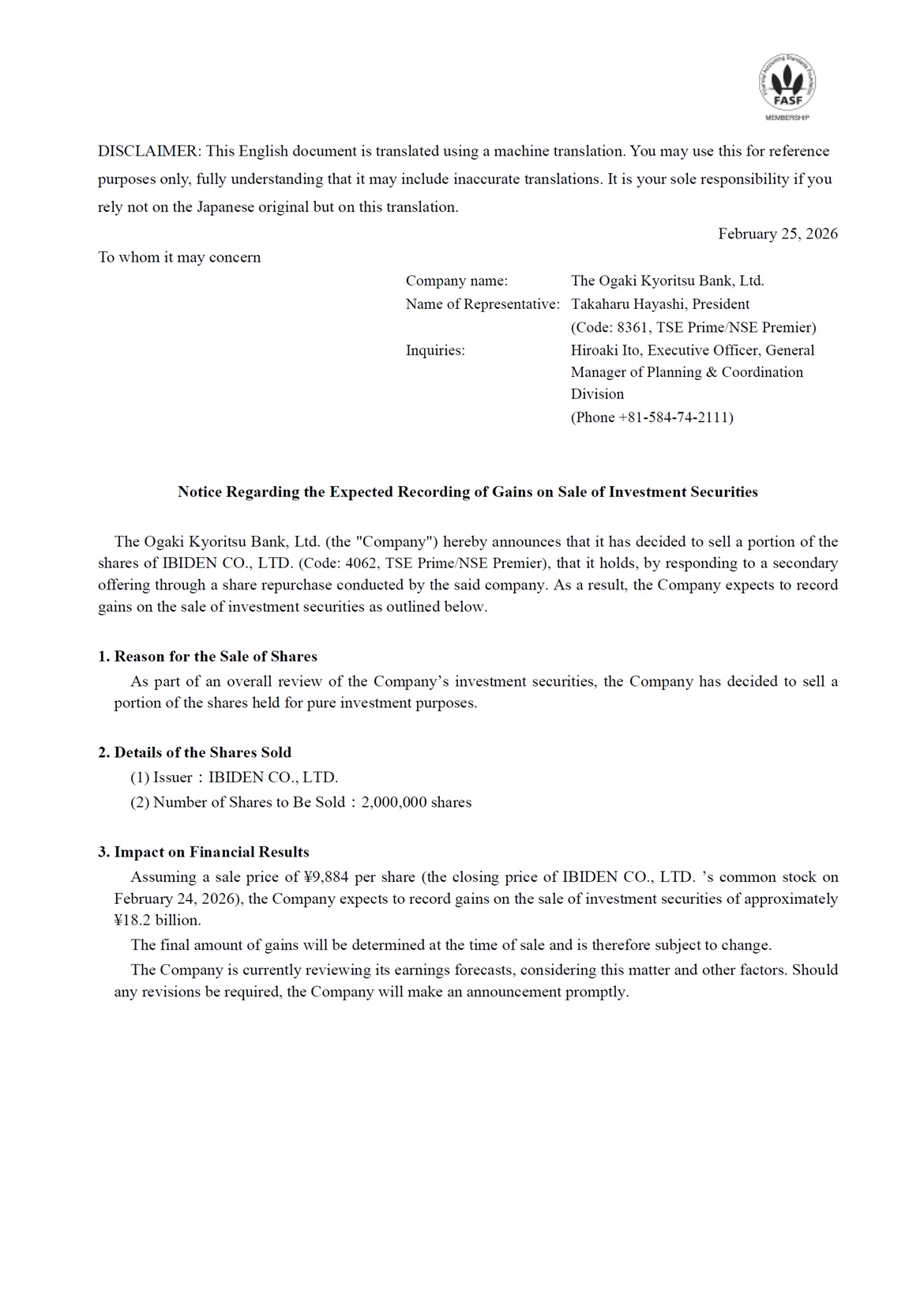 Notice Regarding the Expected Recording of Gains on Sale of Investment Securities