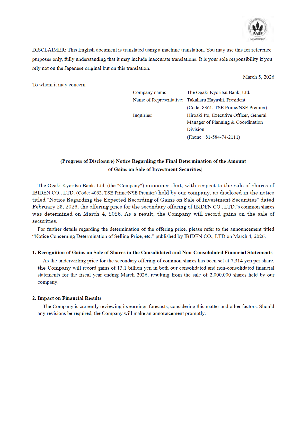 (Progress of Disclosure) Notice Regarding the Final Determination of the Amount of Gains on Sale of Investment Securities