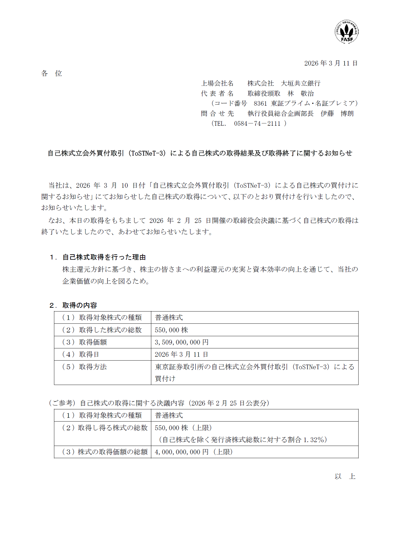 自己株式立会外買付取引(ToSTNeT-3)による自己株式の取得結果及び取得終了に関するお知らせ