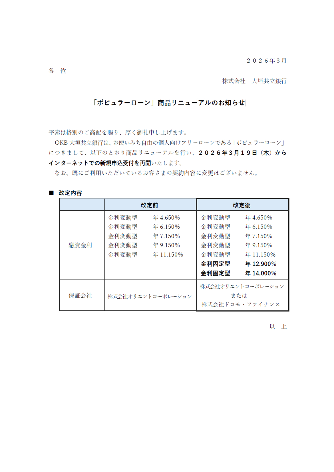 「ポピュラーローン」商品リニューアルのお知らせ