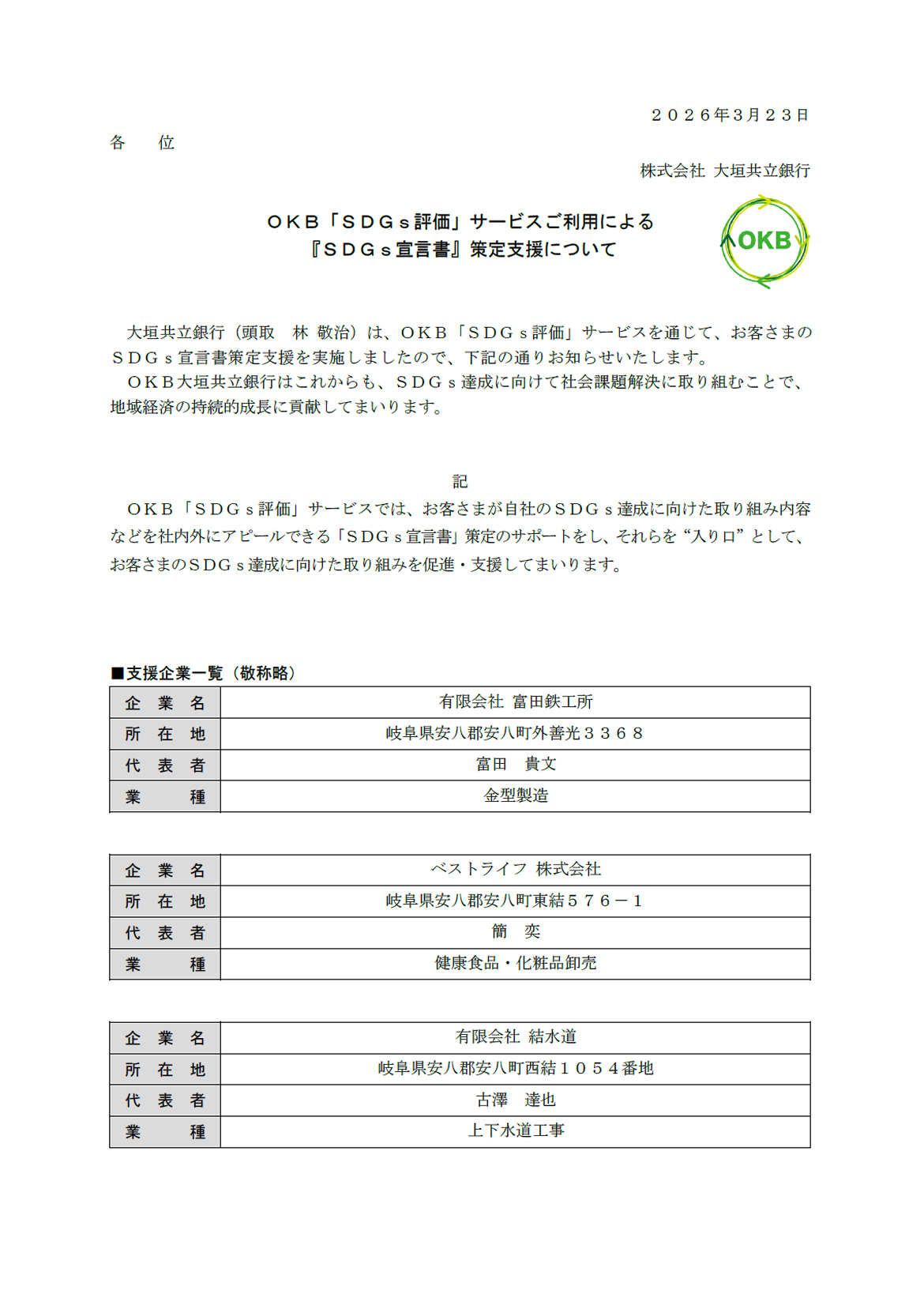 OKB「SDGs評価」サービスご利用による『SDGs宣言書』策定支援について