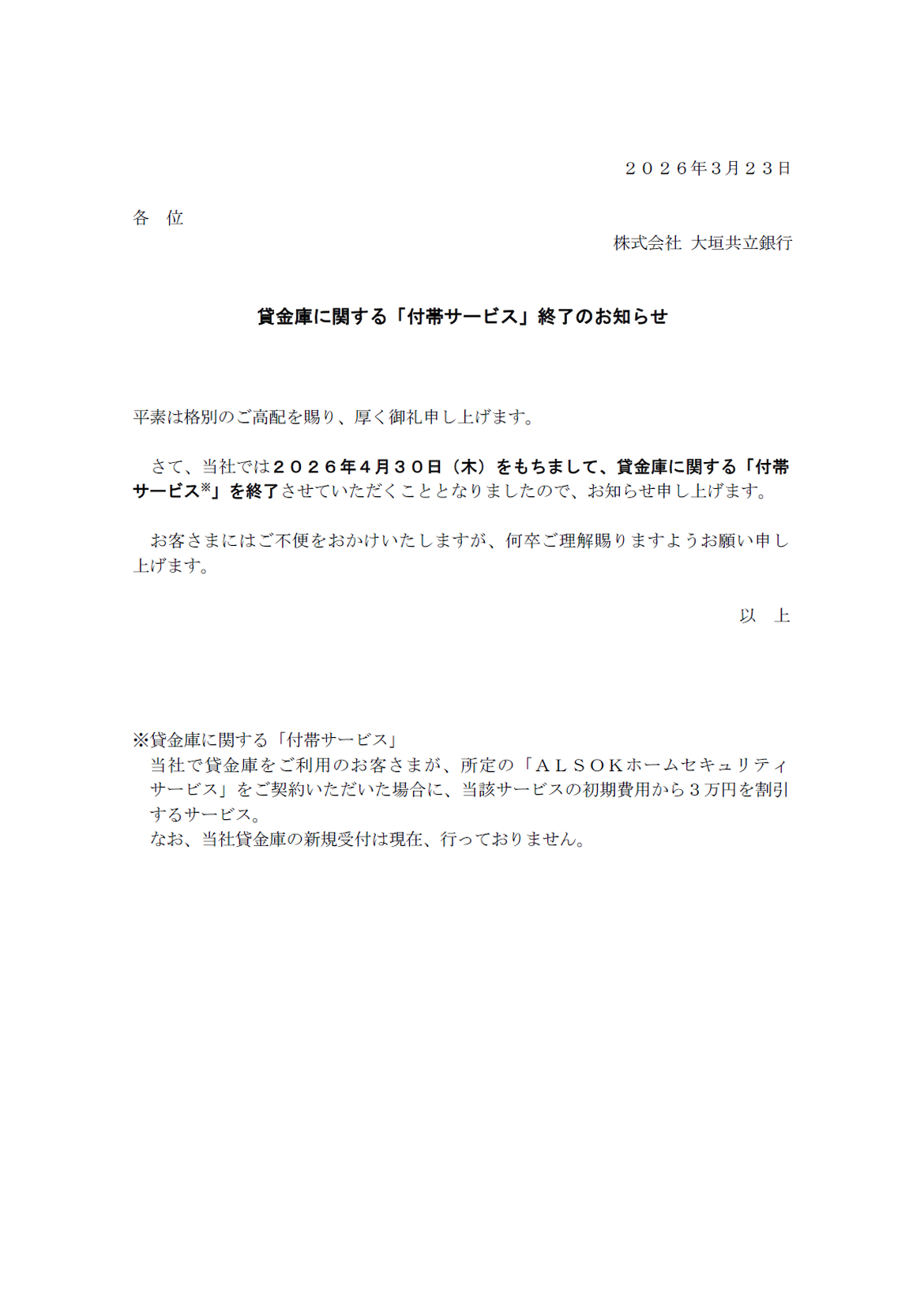 貸金庫に関する「付帯サービス」終了のお知らせ