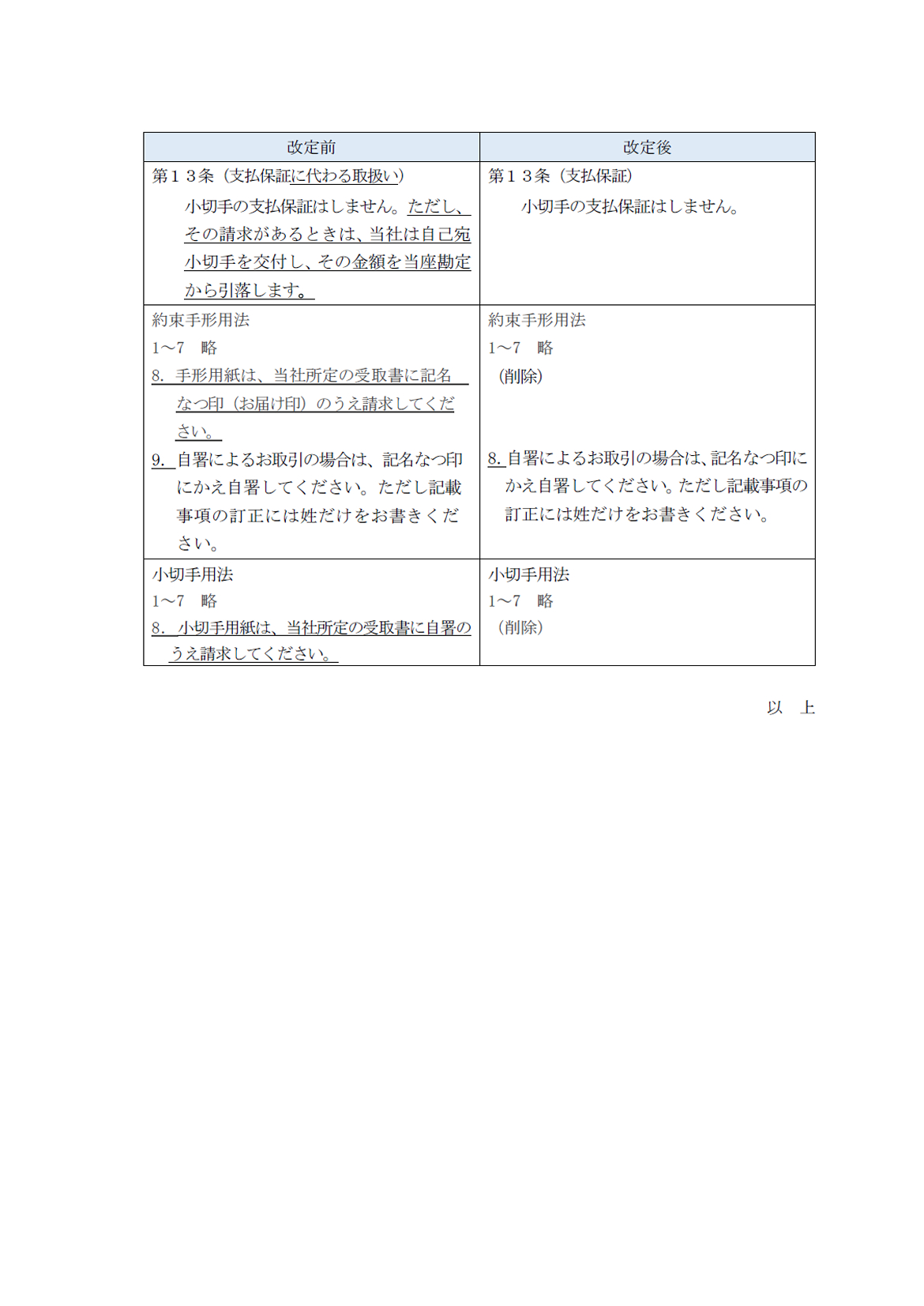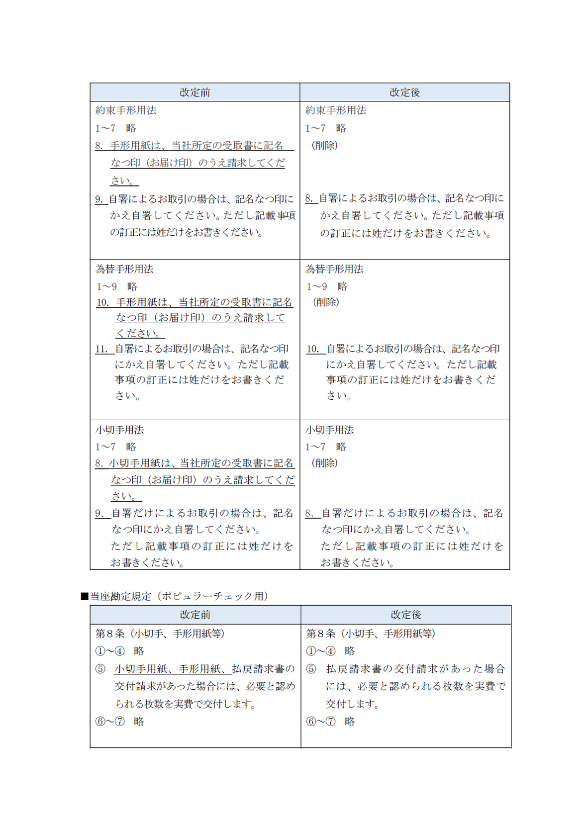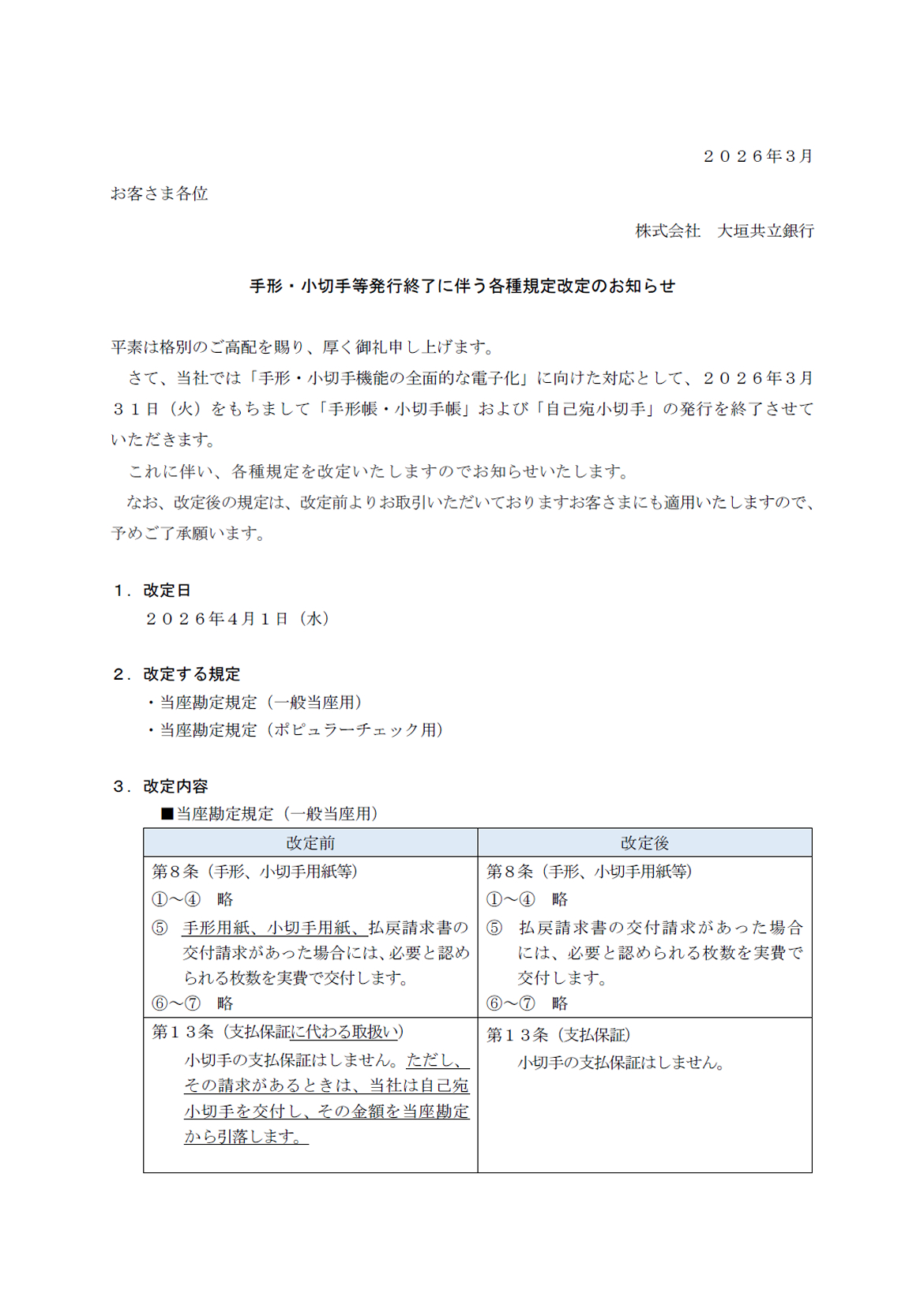 手形・小切手等発行終了に伴う各種規定改定のお知らせ
