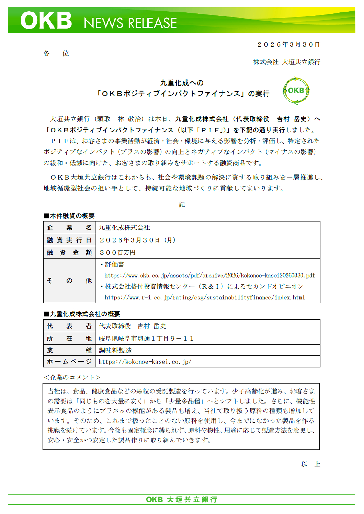 九重化成への「OKBポジティブインパクトファイナンス」の実行