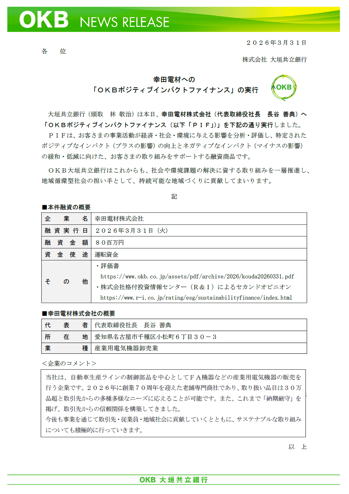 幸田電材への「OKBポジティブインパクトファイナンス」の実行