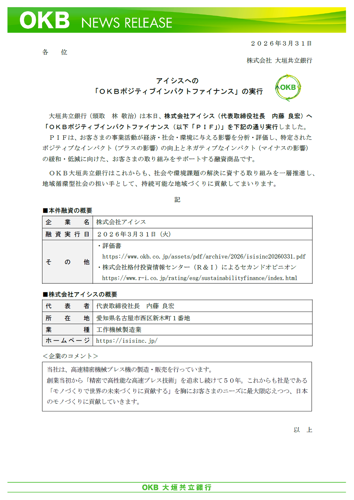 アイシスへの「OKBポジティブインパクトファイナンス」の実行