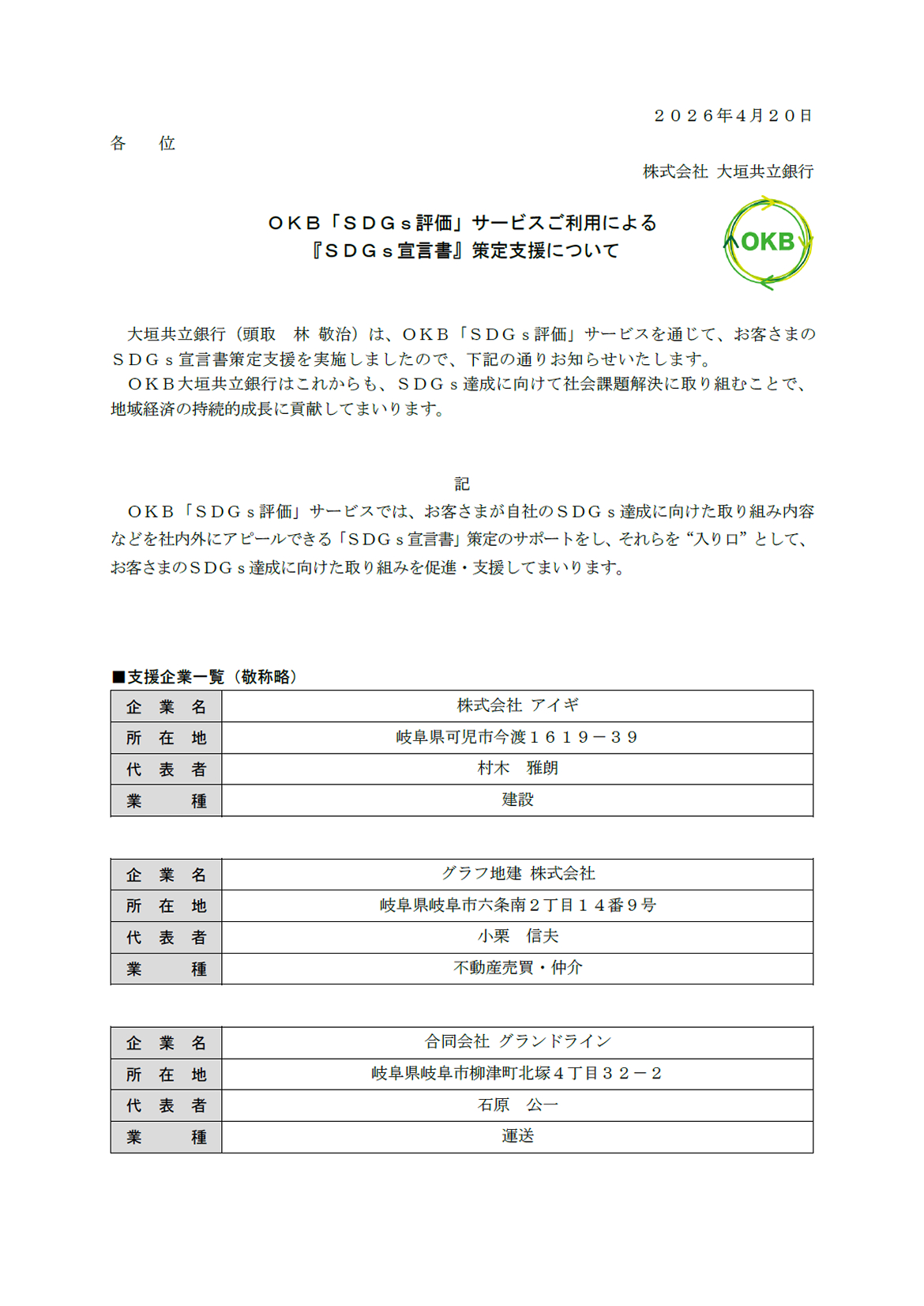 OKB「SDGs評価」サービスご利用による『SDGs宣言書』策定支援について