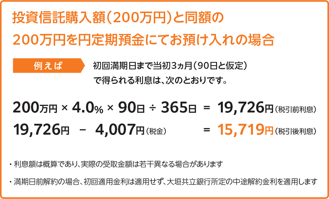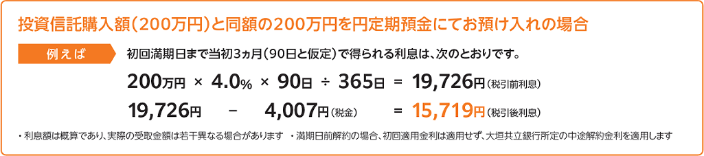 投資信託申込の翌月末日までに円定期預金を預け入れいただく場合、投資信託購入金額と同額までの円定期預金(3ヵ月もの)に特別金利を適用します
