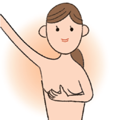 乳房や乳首をしぼるようにして、乳首から分泌物が出ないか調べます。その後、乳房に石鹸などをつけて滑りやすくし、4本の指を乳房に当て指を何度か滑らせ両脇の下のリンパ節も調べます。
