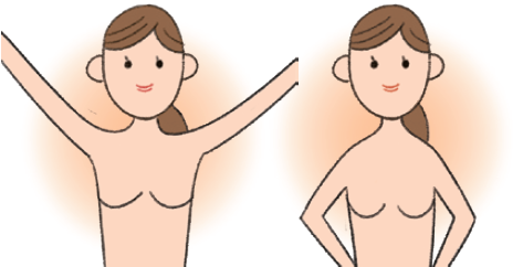 腕を高く上げたり両腕を腰に当てたりして乳房、乳頭を観察します。