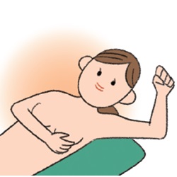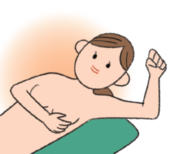 背中の後ろに枕などをあて、体を傾けたとき、乳房が左右にずれないようにし、乳房全体を触ります。