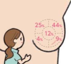 左右の乳房とも上部外側に最もがんができやすく、続いて上部内側、中央部、下部外側、下部内側の順になります。