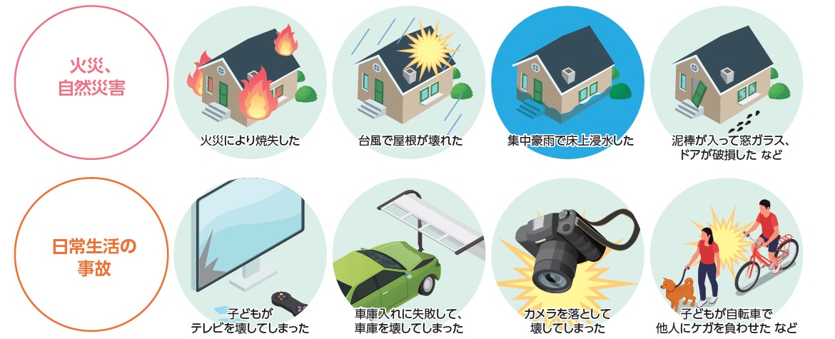 住宅ローンを利用の方には「火災保険」に加入いただきます。火災をはじめとするさまざまな災害から日常生活の思いもよらないリスクまで、大切な建物・家財が幅広く補償される保険です。