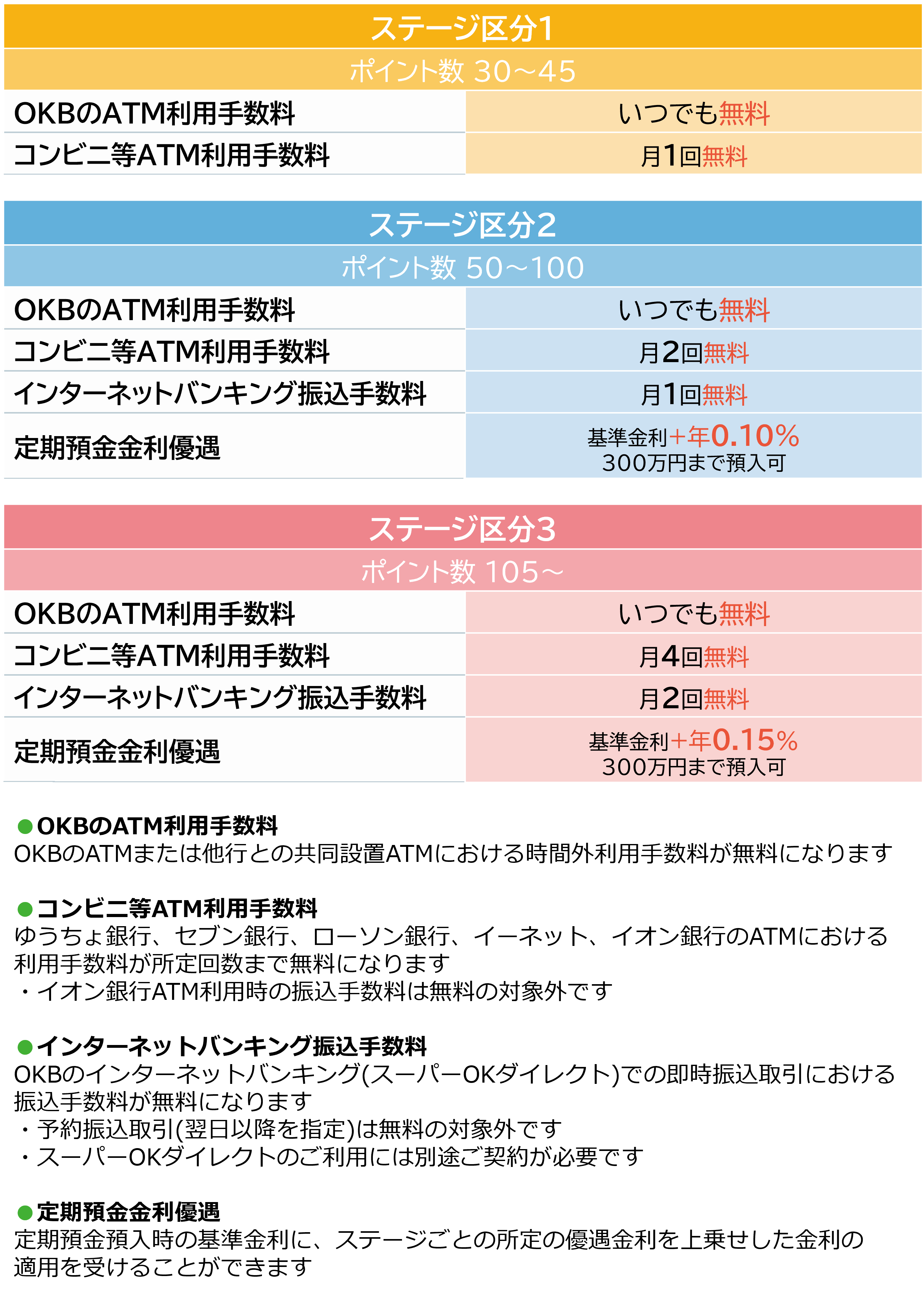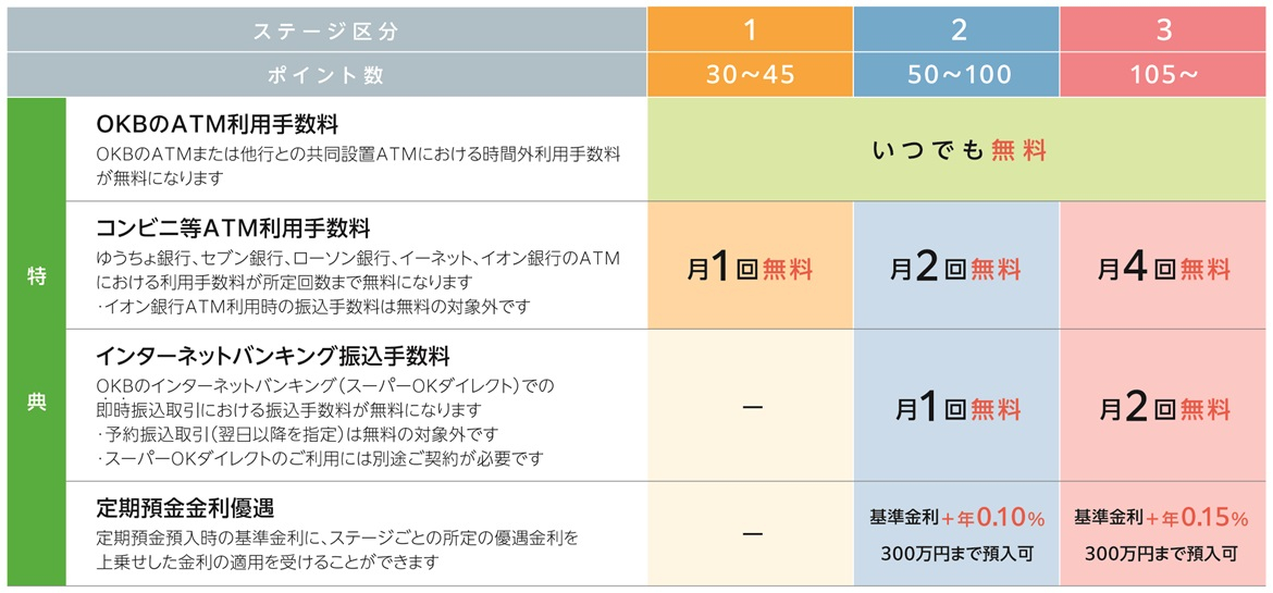 - 国債等公共債、投資信託は当社またはOKB証券との各取引における指定預金口座店の取引または残高となります。当該条件以外の、取引店以外の他店口座や異なるお客さま(CIF)番号の取引または残高、ご家族の取引または残高などは合算されません。