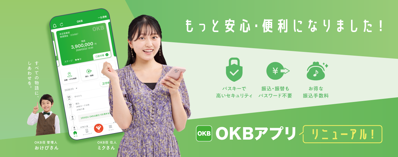 - 最新版のOKBアプリのご利用可能環境は、iOSの場合16.0以上、Androidの場合10.0以上となります。また、適切なセキュリティ対策ソフトを導入し、常に最新の状態に保っていただくことをおすすめします。