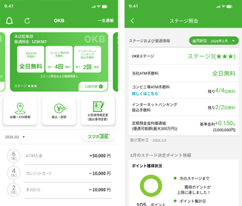 今月のOKBステージやステージに応じた特典がひと目で確認できます。