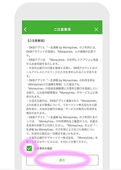 【1】 利用条件およびマネーツリーの利用規約と個人情報保護方針に同意いただける場合は、図のようにチェックを入れて、「同意して進む」を押します。