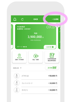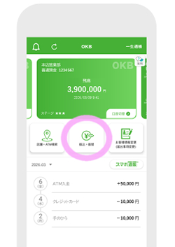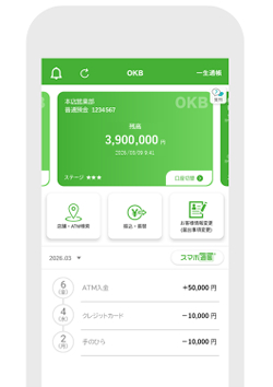 - 「スマホ通帳」は、OKBアプリの「口座」画面から、1タップでカンタンに切り替えて利用いただけます。